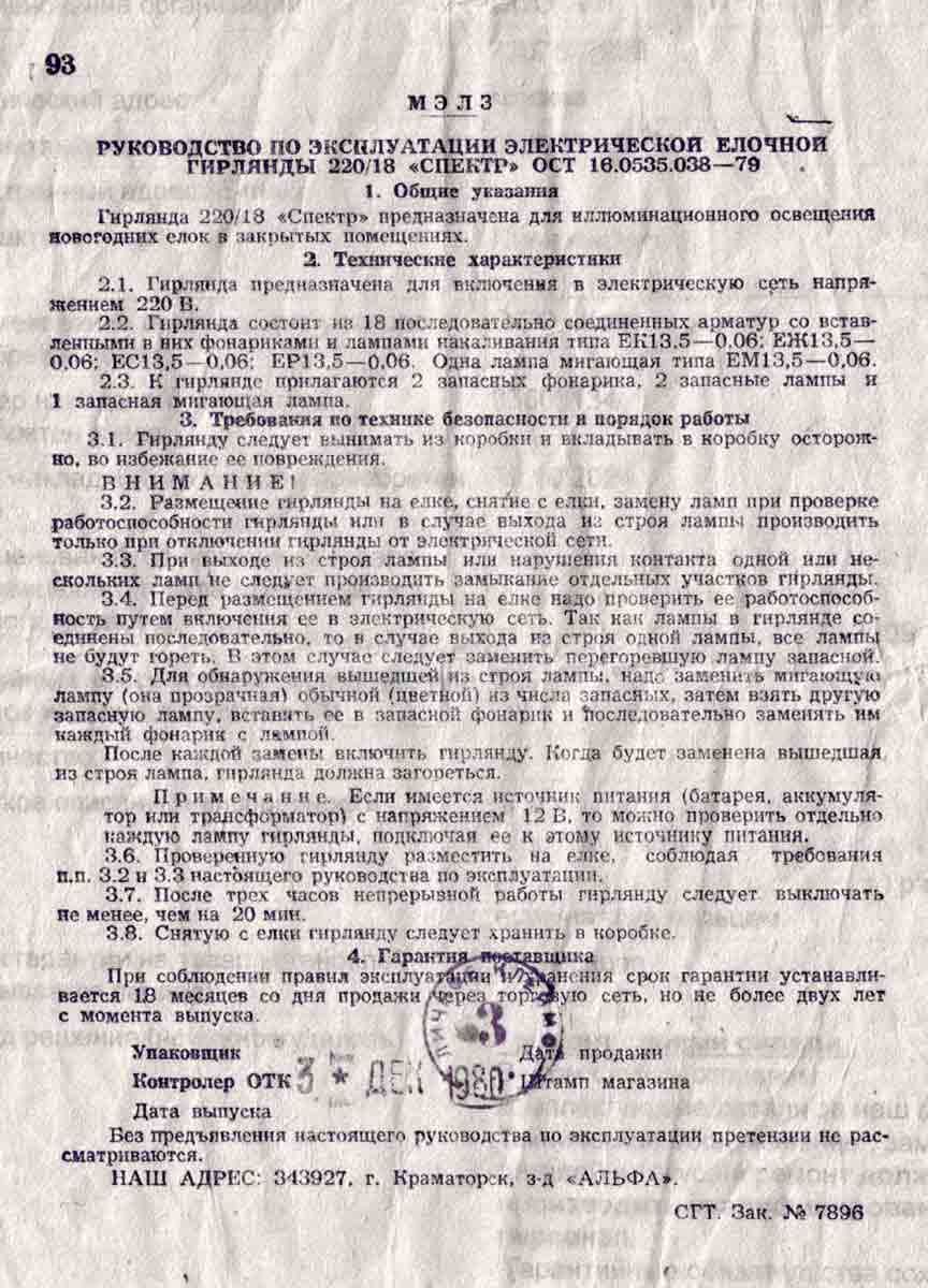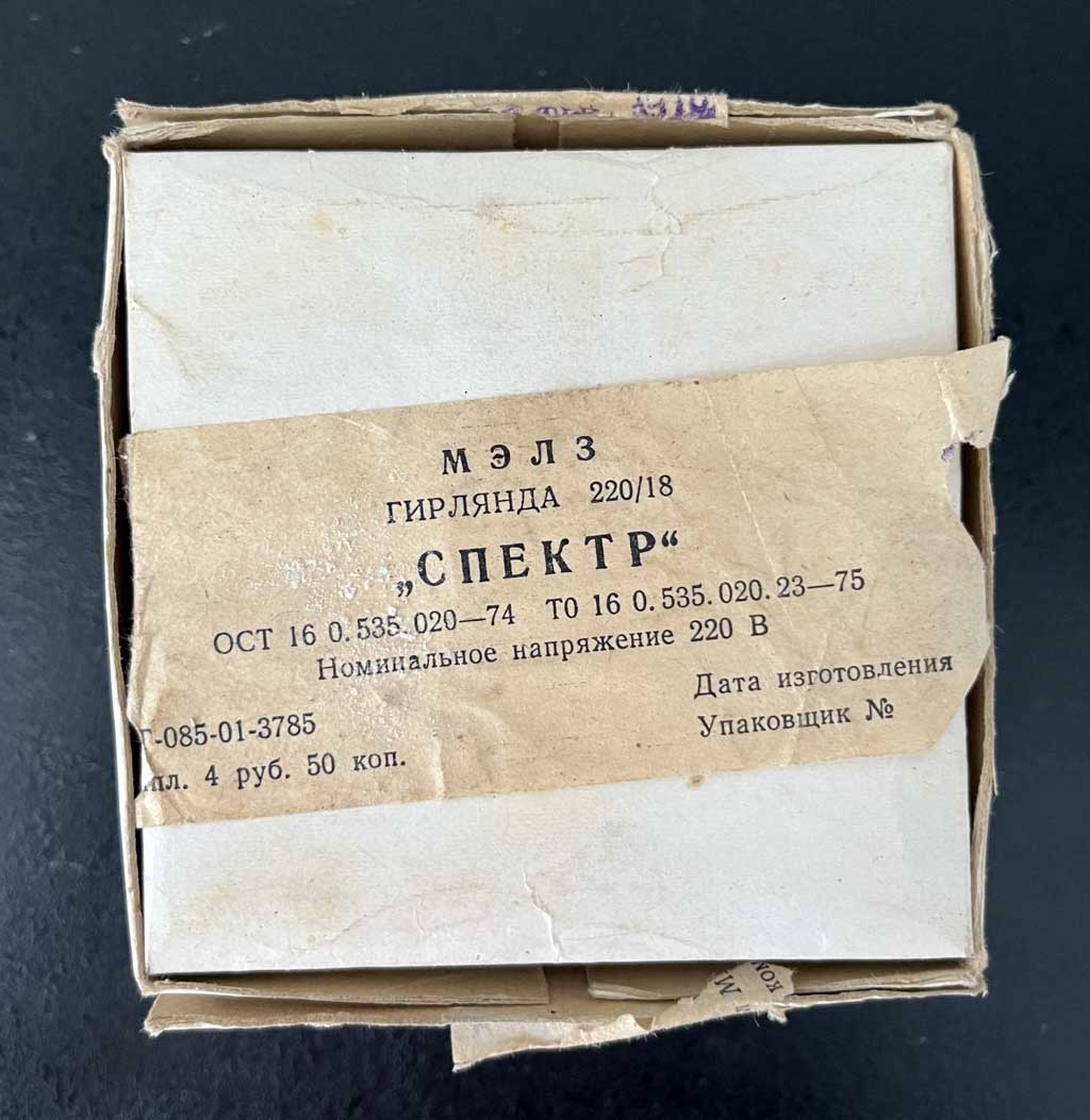 Ёлочная гирлянда "Спектр" выпускалась возможно с 1977 года филиалом Московского электролампового завода, Краматорским заводом "Альфа". Питание сеть 220 В. Ламп в гирлянде 18. Одна лампа мигающая.