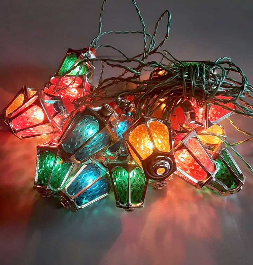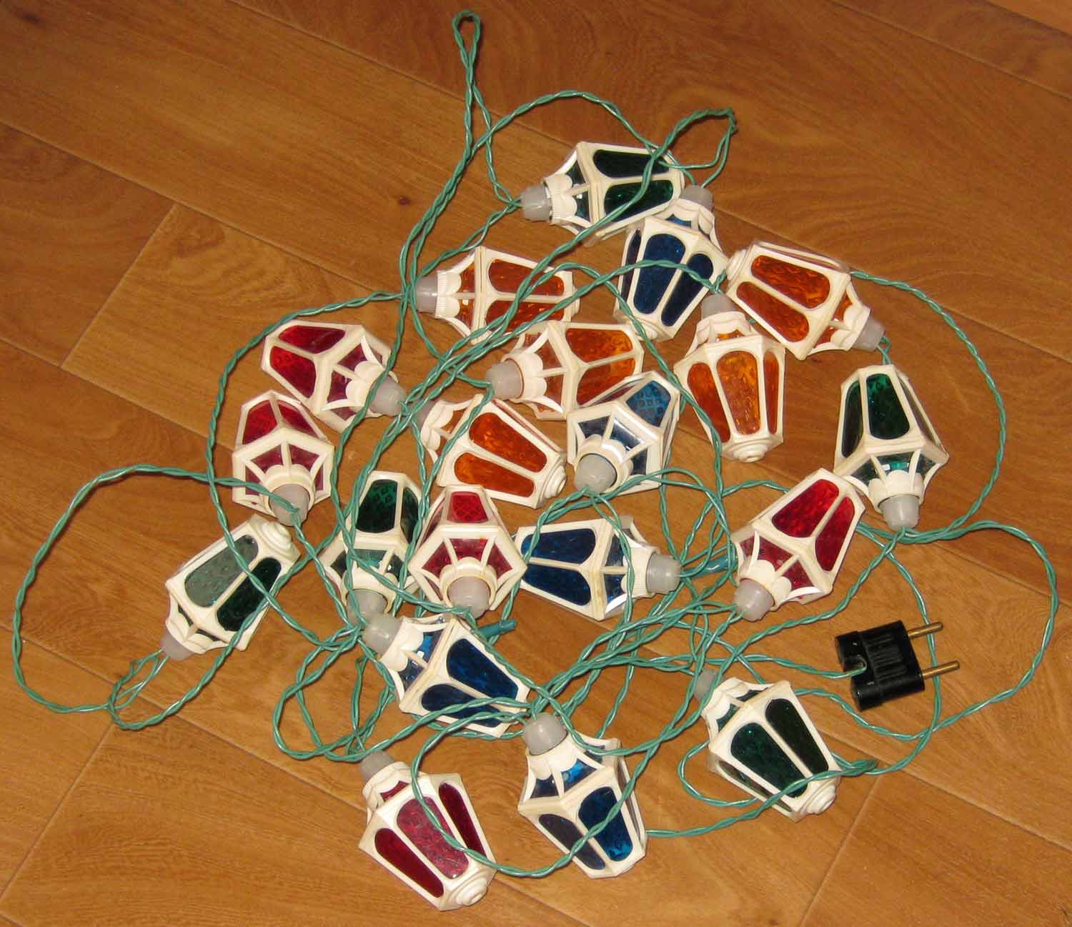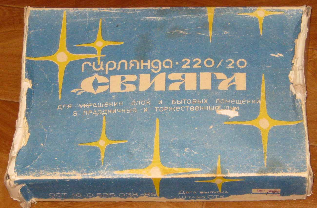 Гирлянда "Свияга" выпускалась возможно с 1984 года Казанским электротехническим заводом (КзЭТЗ). 220 В. 20 ламп МН13,5-0,16. 4 цвета. Фотографии Владимира Чащихина, город Пермь.