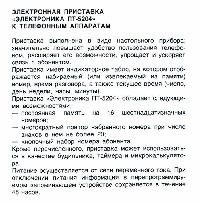 Электронная приставка "Электроника ПТ-5204" производилась возможно с 1986 года. Сервисное устройство для удобства пользования телефоном.