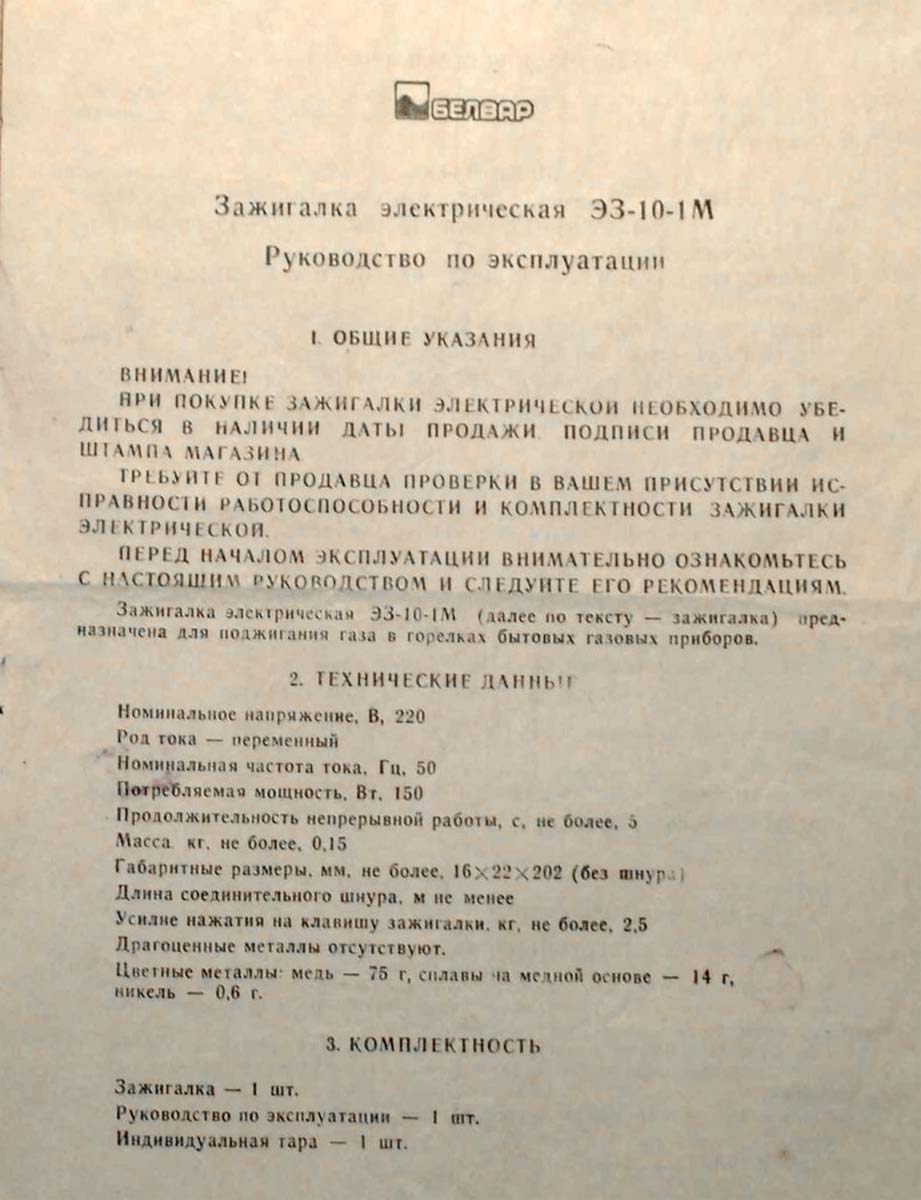 Зажигалка электрическая "ЭЗ-10-1М" выпускалась возможно с 1992 года Белорусским ПО "Белвар". Предназначена для поджигания газа в горелках бытовых газовых приборов.