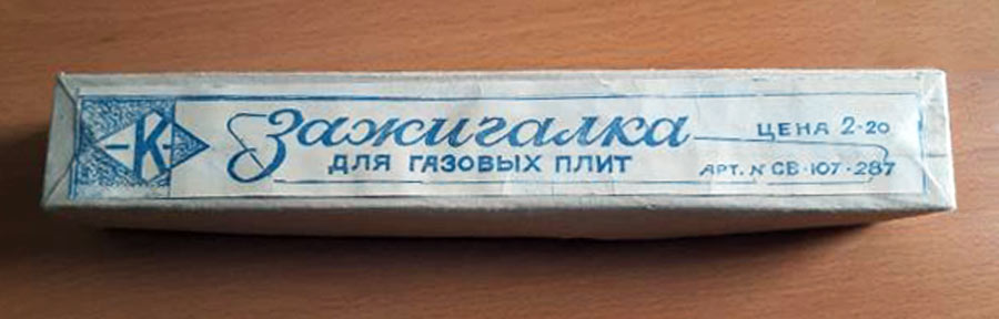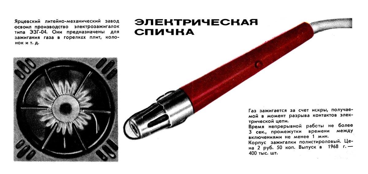 Электрическая спичка (электрозажигалка) "ЭЗГ-04" выпускалась с 1967 года Ярцевским литейно-механическим заводом. Предназначена для розжига газа в бытовых газовых приборах.