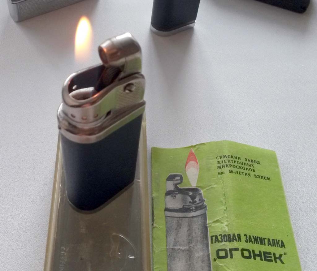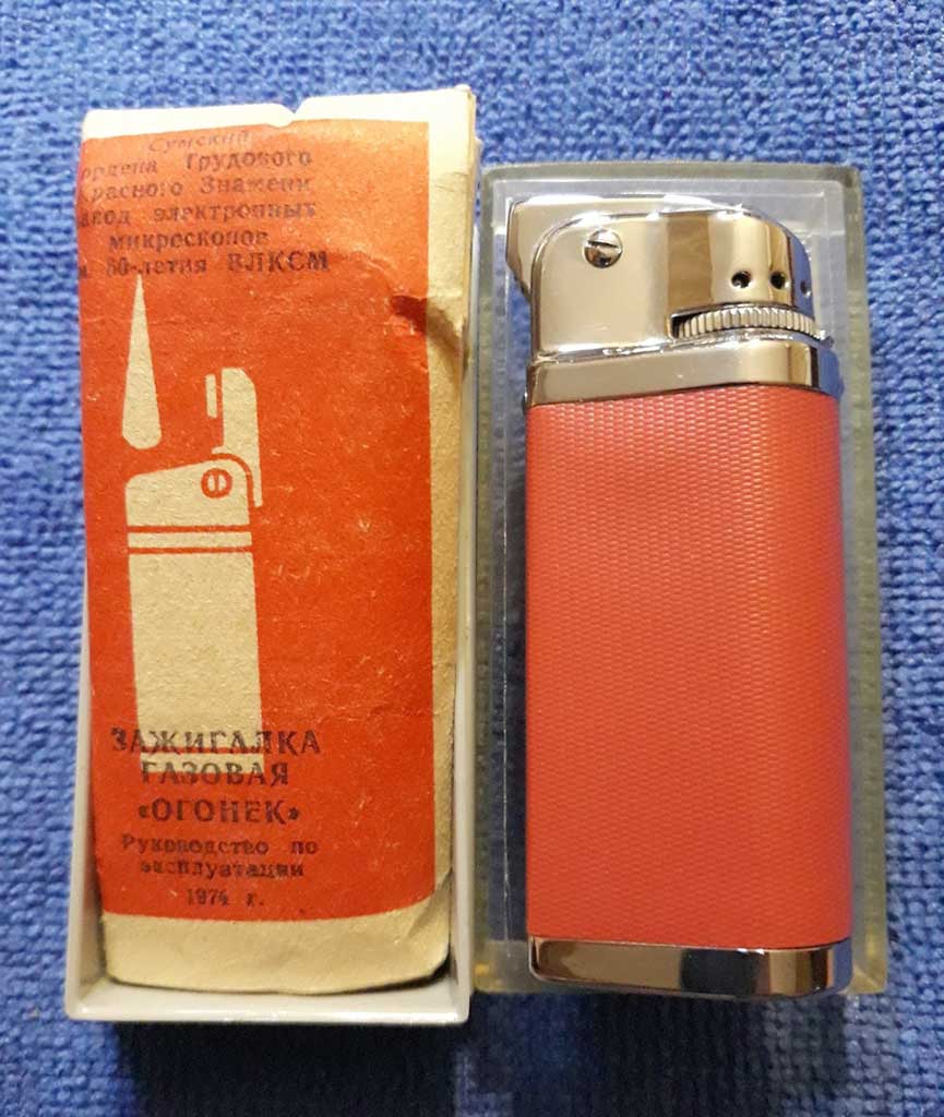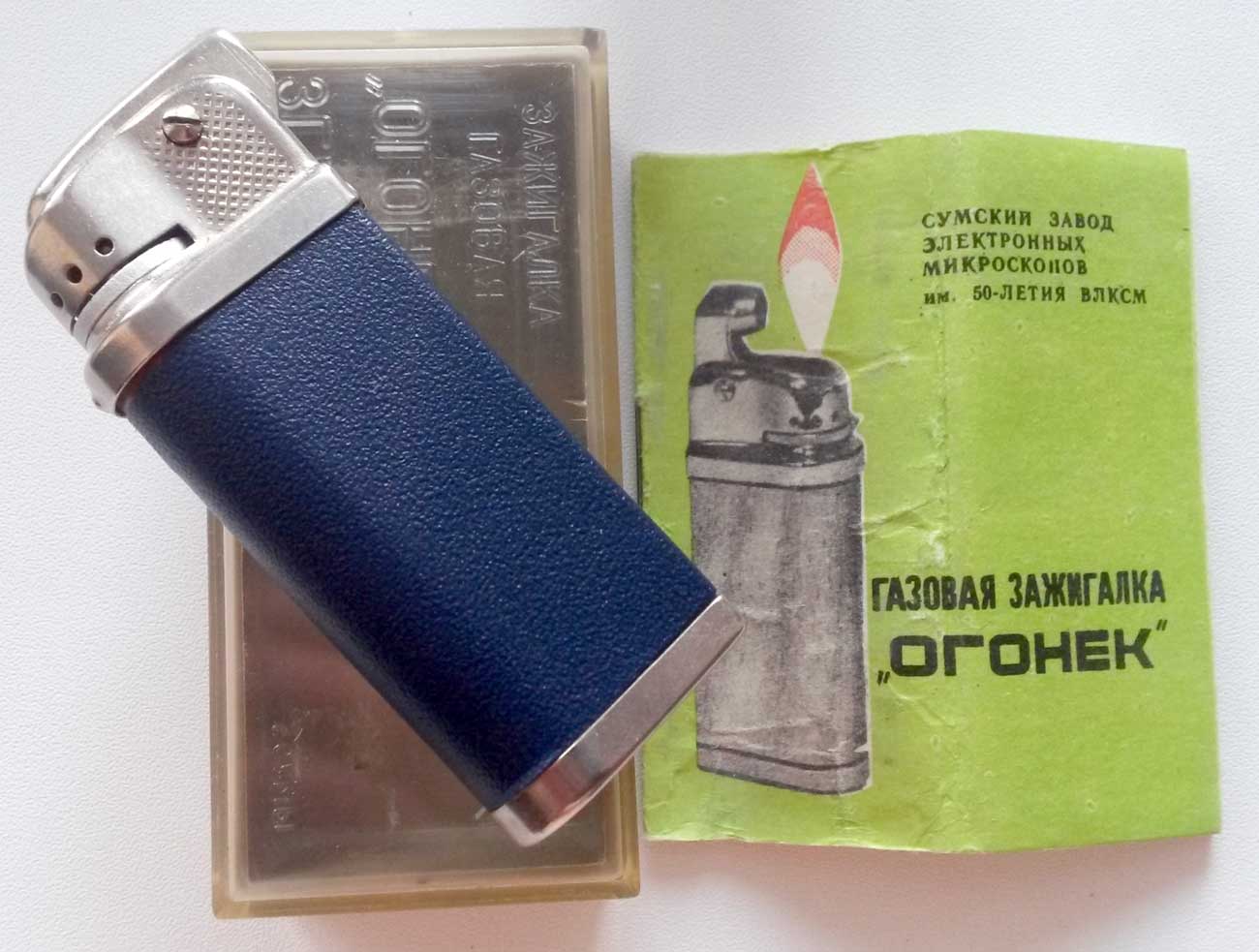 Карманная газовая зажигалка "Огонёк" производилась возможно с 1973 года Сумским заводом электронных микроскопов. Зажигалка предназначена для прикуривания папирос и сигарет.