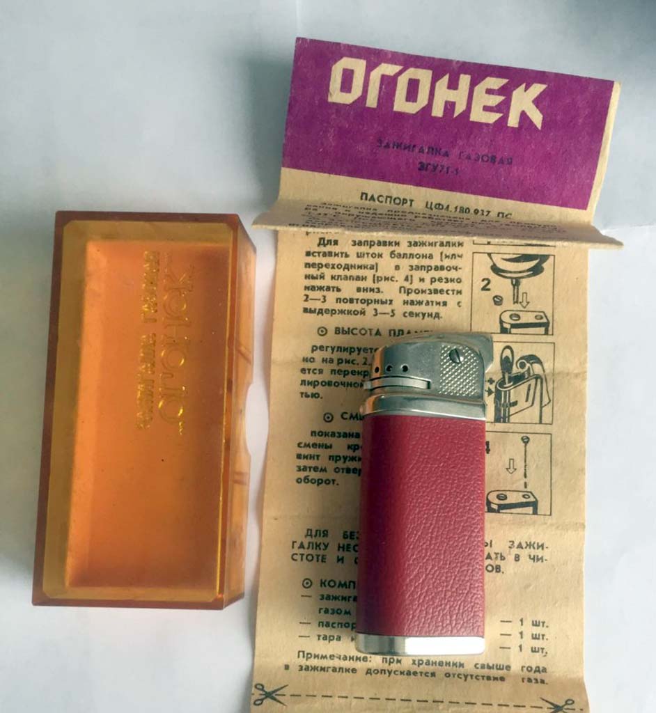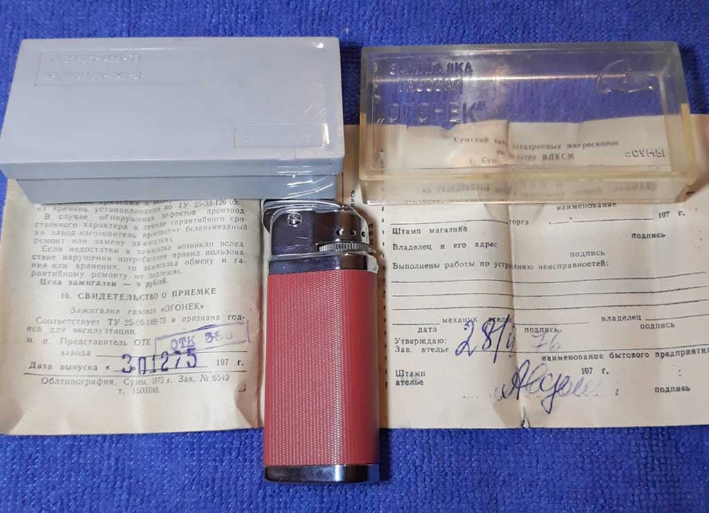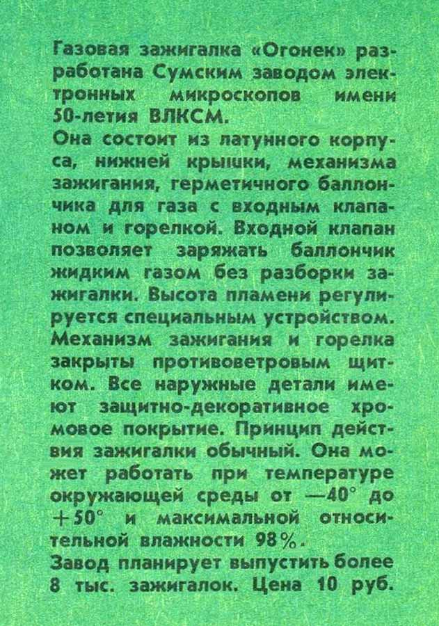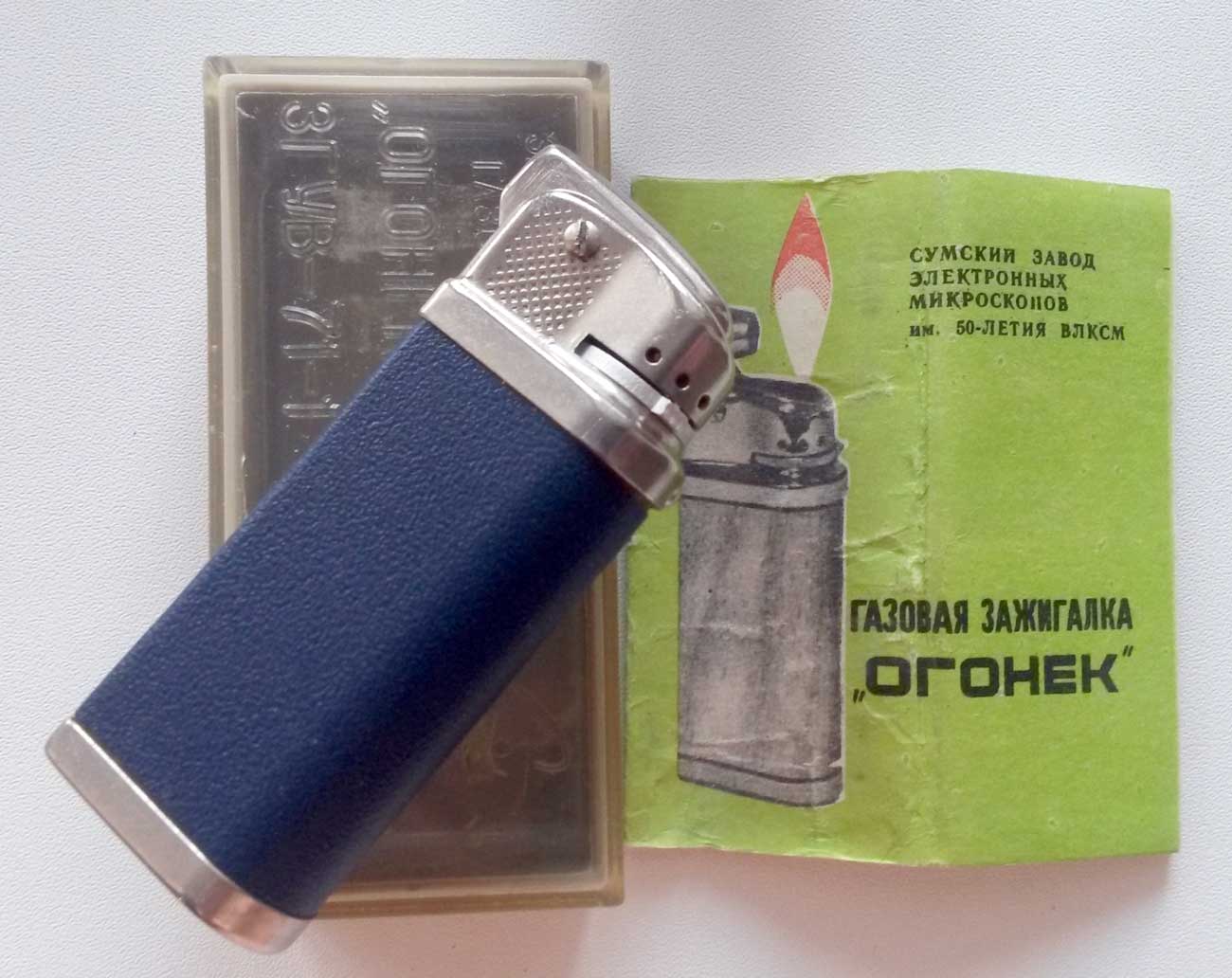 Карманная газовая зажигалка "Огонёк" производилась возможно с 1973 года Сумским заводом электронных микроскопов. Зажигалка предназначена для прикуривания папирос и сигарет.