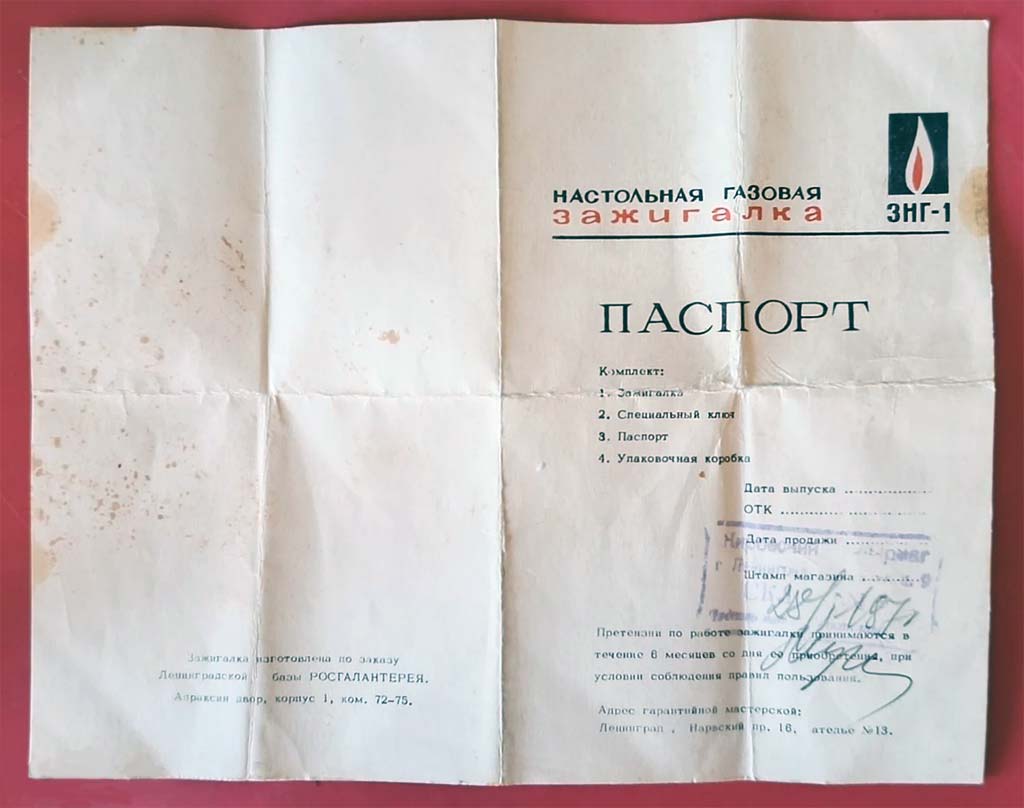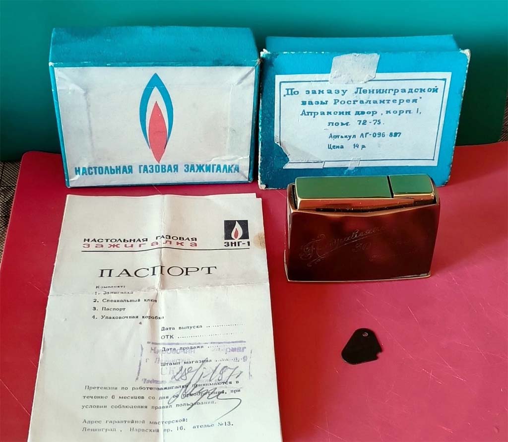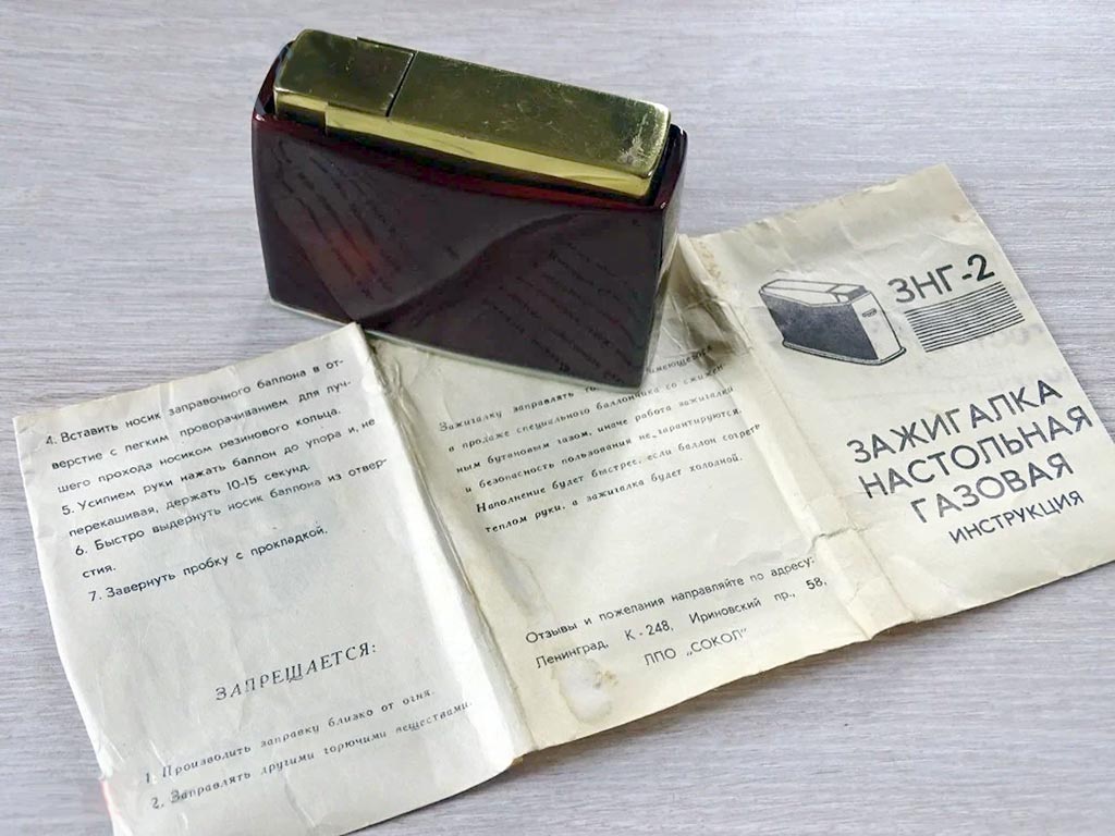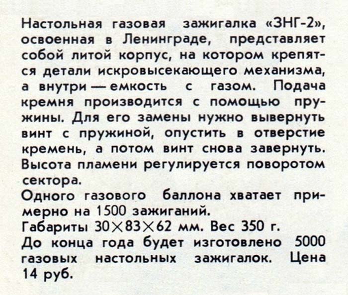 Настольная газовая зажигалка "ЗНГ-2" выпускалась с 1971 года Ленинградским ЛПО "Сокол". Зажигалка "ЗНГ-2" - кремниевая. Одной заправки ёмкости с газом и одного кремня достаточно на 1500 зажиганий.