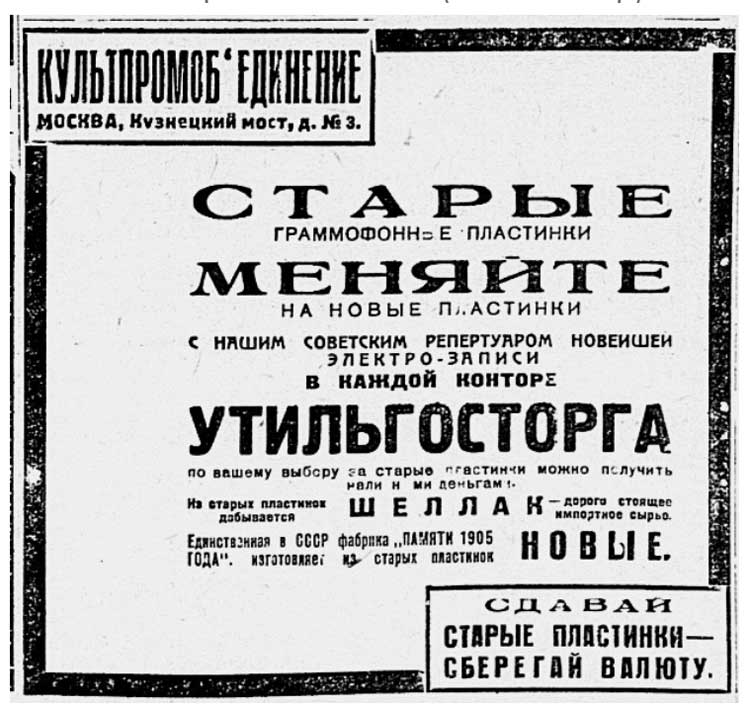 обмена на обломки старых пластинок, которые пускали в переплавку. На пластинках