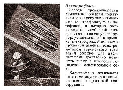 Электрофоны - патефоны с непосредственным рупорным излучателем звука и электрическим приводом выпускались с 1934 года Московскими областными заводами промкооперации.