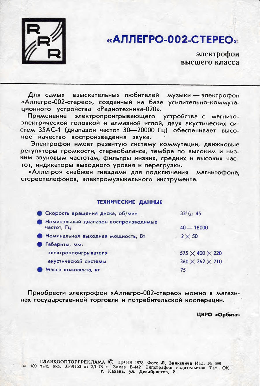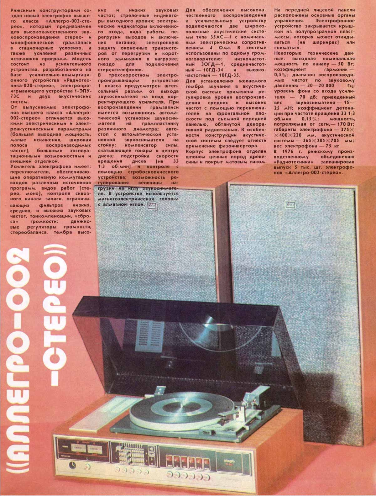 электрофон "Аллегро-002-стерео" с 1976 года выпускал "Рижский электромеханический