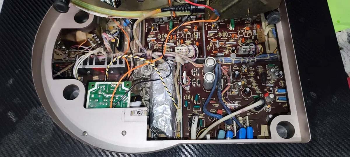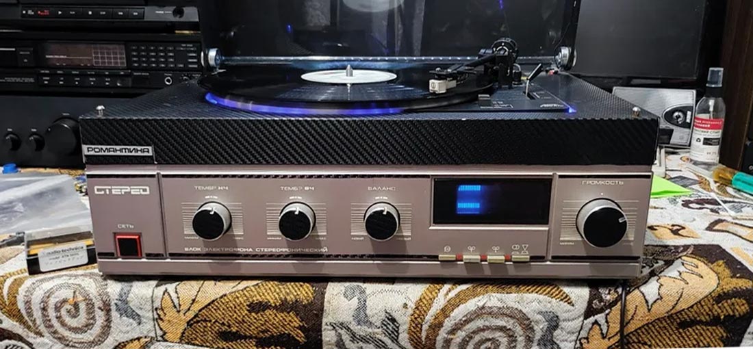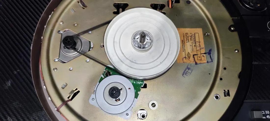 Имеется фонокорректор. Скорости ЭПУ 33 и 45 об/мин. Два двигателя с общим