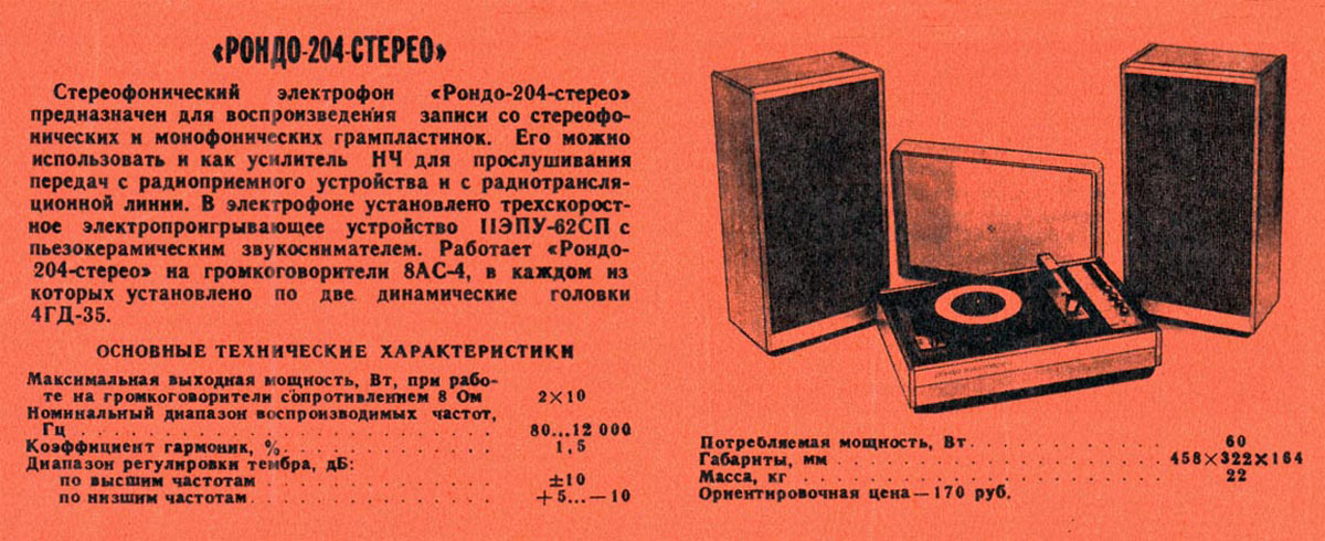 как и электрофон "Рондо-204-стерео", но отличающихся одной АС, одним каналом