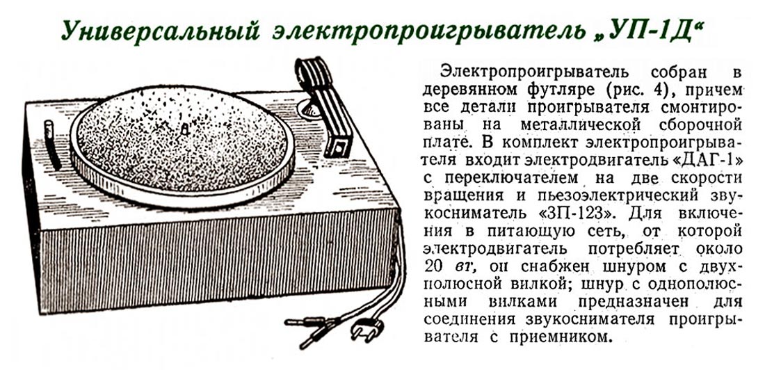 электропроигрыватель "УП-1Д" подготовлен к выпуску с 1954 года. Электропроигрыватель
