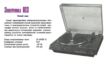 Электропроигрыватель высшего класса "Электроника-013" подготовил к выпуску с 1983 года Брянский завод технологического оборудования.