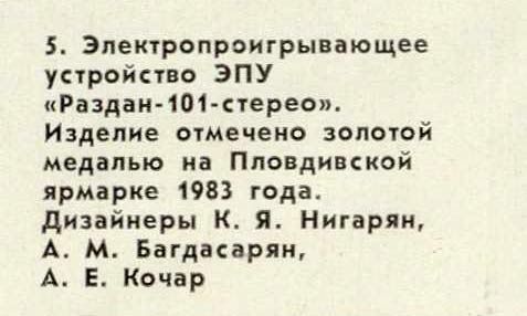 Стереофоническое электропроигрывающее устройство первого класса "Раздан-101-стерео" разработано в 1983 году в Армянском филиале ВНИИТЭ. Другой информации пока нет.