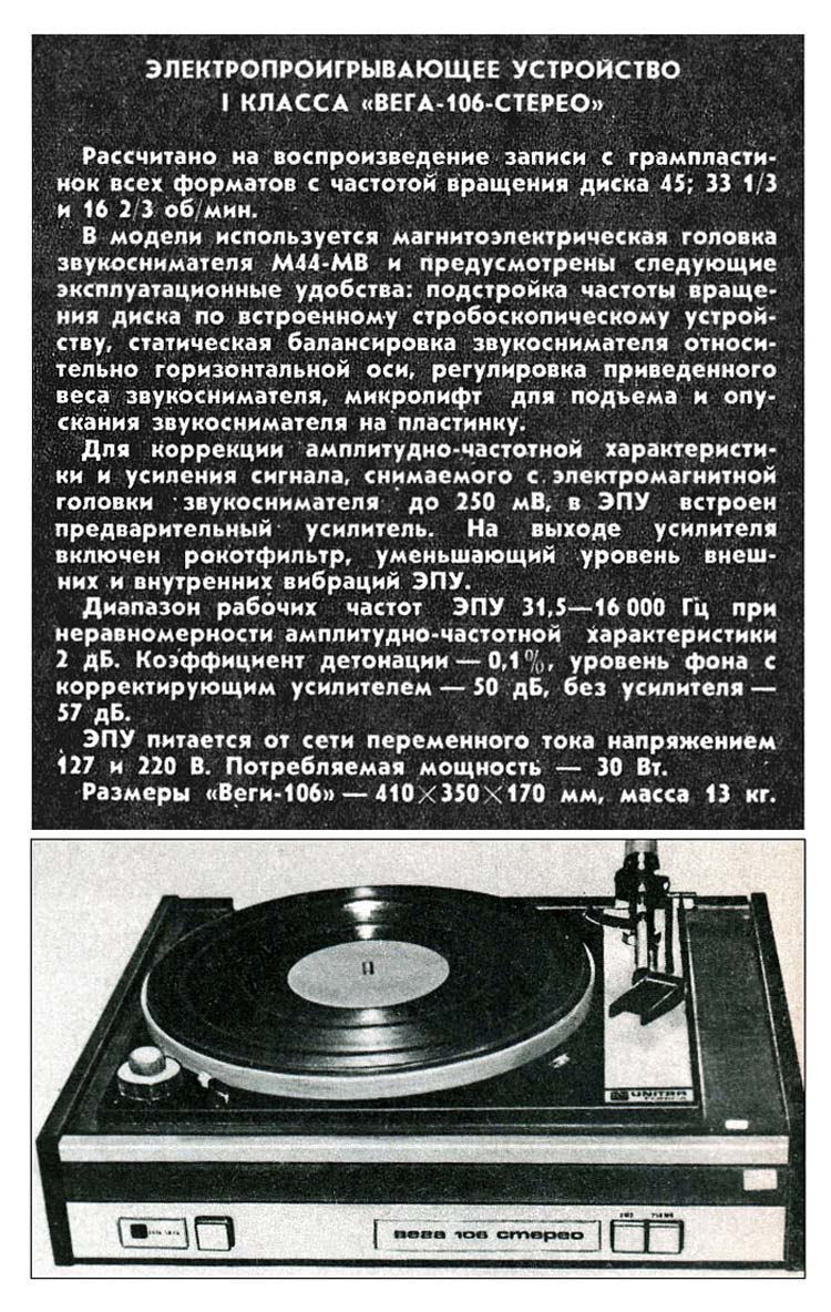 электропроигрыватель 1-го класса "Вега-106-стерео" с 1976 года выпускал