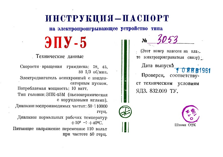Электропроигрывающее устройство "ЭПУ-5" выпускалось возможно с 1958 года. "ЭПУ-5" устанавливалось например в радиолу "Беларусь-59". Инструкция по эксплуатации.
