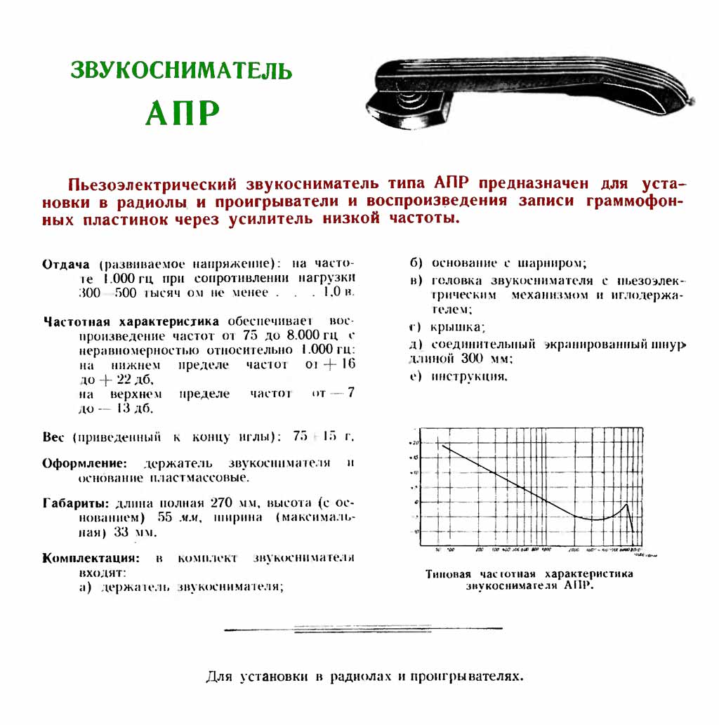 Пьезоэлектрический звукосниматель "АПР" выпускался возможно с 1948 года. Справочник "Радиовещательная аппаратура" выпуск № 2 за 1951 год.