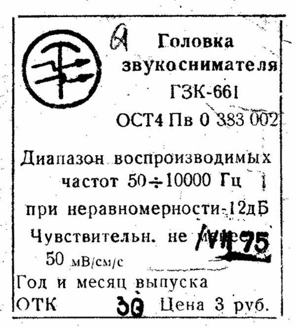 Головка звукоснимателя "ГЗК-661" выпускалась предположительно с 1969 года несколькими предприятиями страны. Служит для ЭПУ, электропроигрывателей, электрофонов и радиол с 1 по 4 классы.