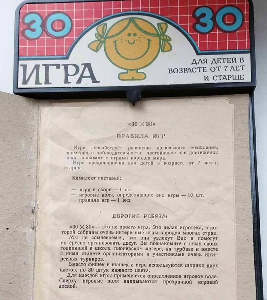 Настольная игра "30 х 30" выпускалась возможно с 1984 года. Содержит 10 настольных игр народов мира. Игра предназначена для детей в возрасте от семи лет и старше.