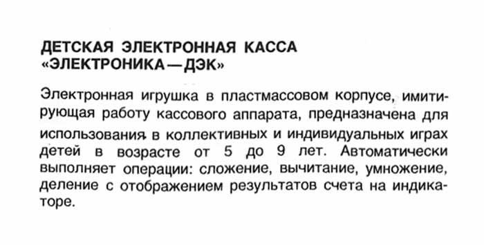 Детская электронная касса "Электроника ДЭК" выпускалась предположительно с 1984 года. Изготовитель не установлен.