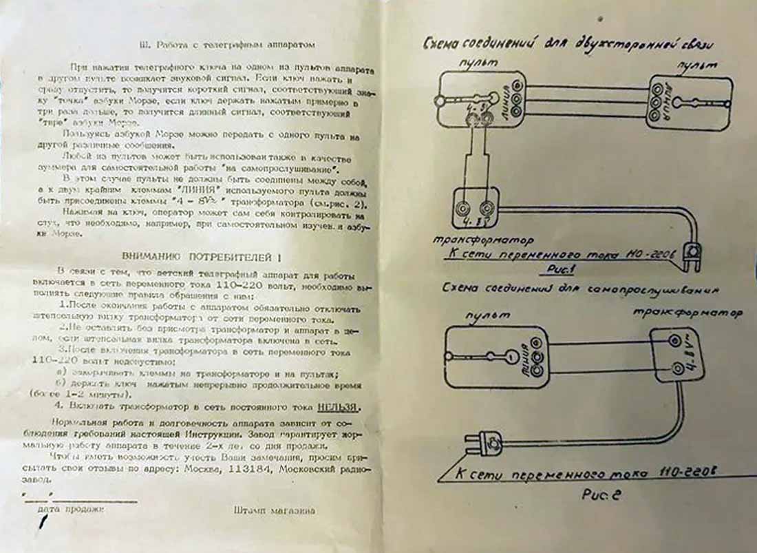 Детский телеграфный аппарат выпускался возможно с 1976 года Московским радиозаводом из комплектующих Шуйского радиозавода (Ивановская обл.). Предназначен для двухсторонней связи азбукой "Морзе".
