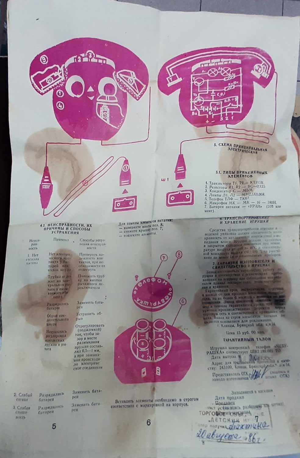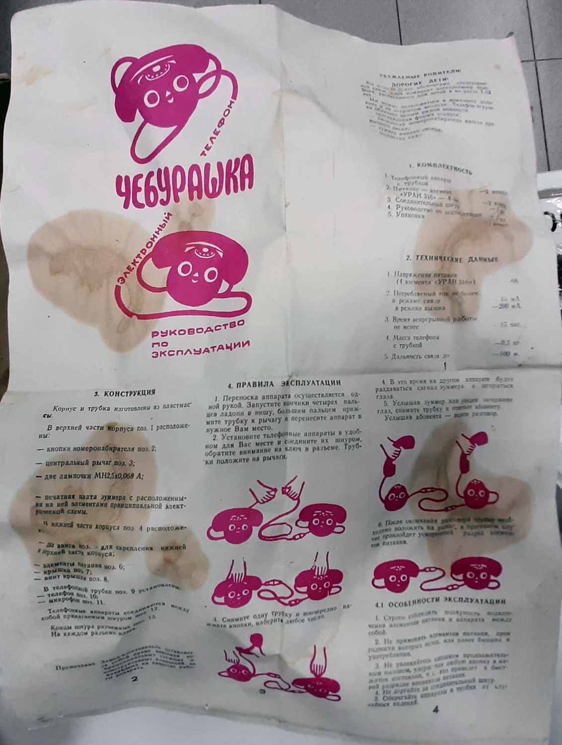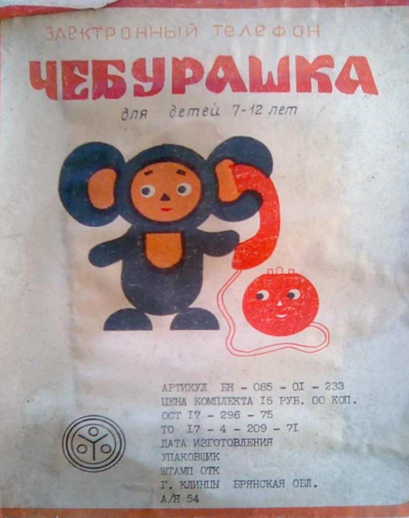 Электронный телефон "Чебурашка" производился предположительно с 1979 года А/Я 54, город Клинцы, Брянской области. Предназначен для связи между двумя абонентами с дальностью проводов до 10 метров.