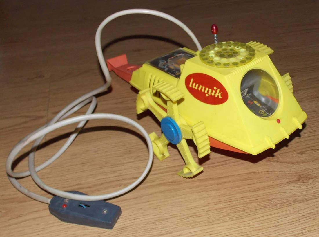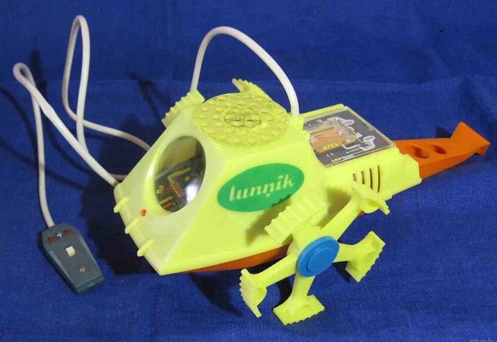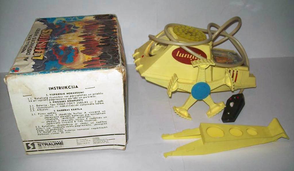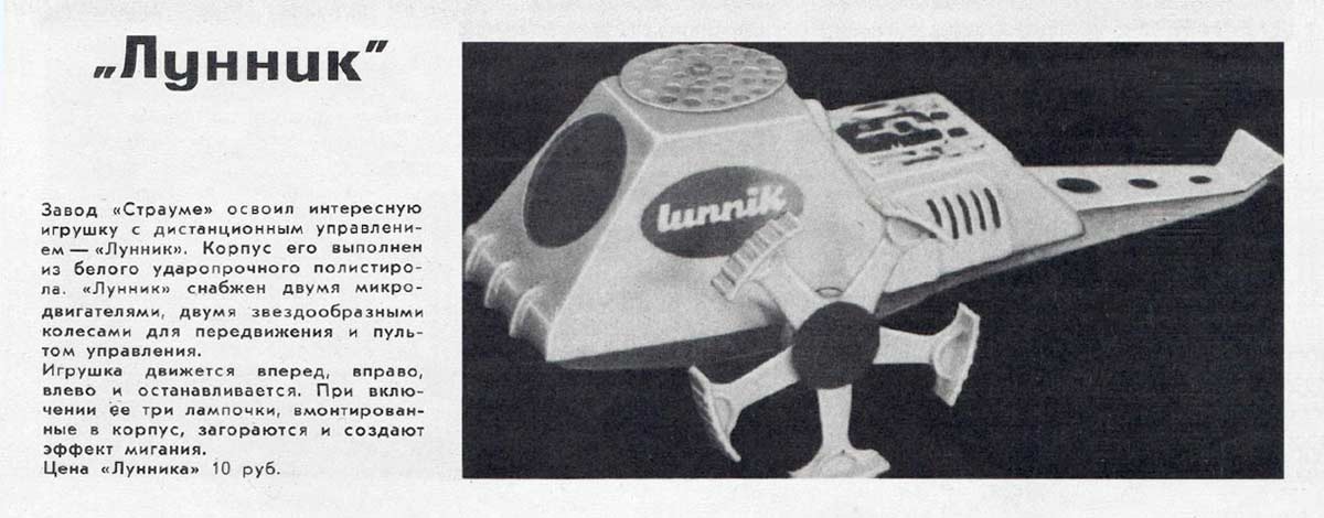 Электронно-механическая игрушка "Лунник" производилась с 1971 года Рижским заводом "Страуме". Игрушка может поворачивать вправо, влево и останавливаться, мигает тремя лампочками, имеет пульт ДУ.