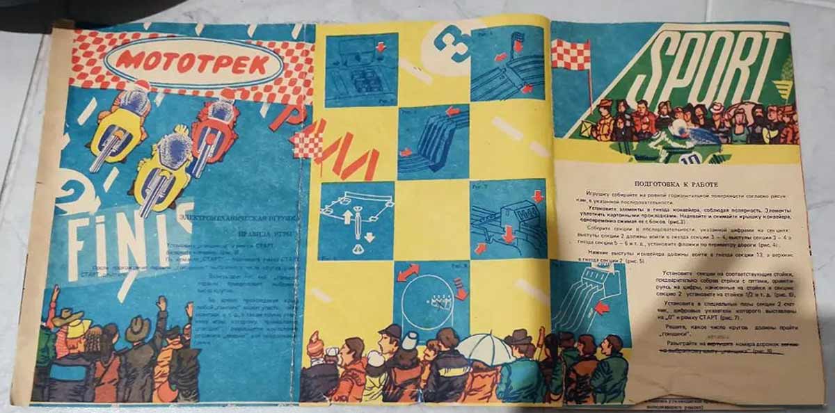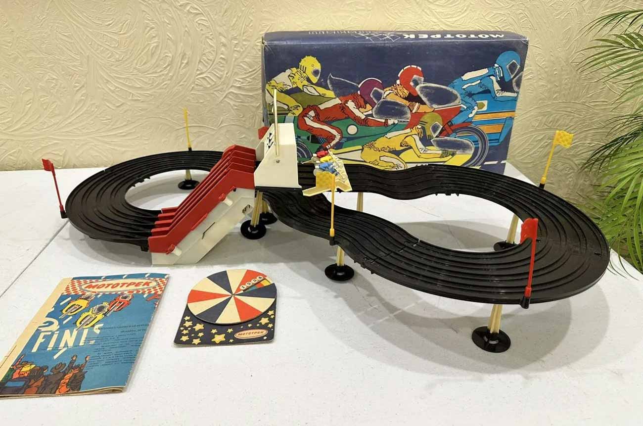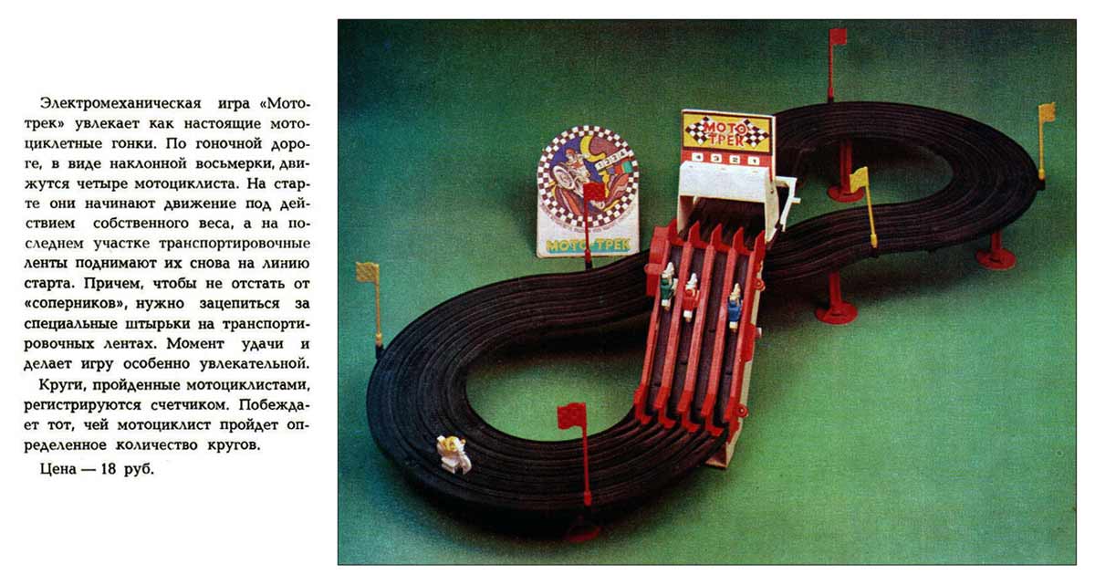 Электромеханическая игра "Мототрек" производилась предположительно с 1984 года. Предназначена для детей младшего и среднего школьного возраста для игры в мотоциклетные гонки по специальному треку.