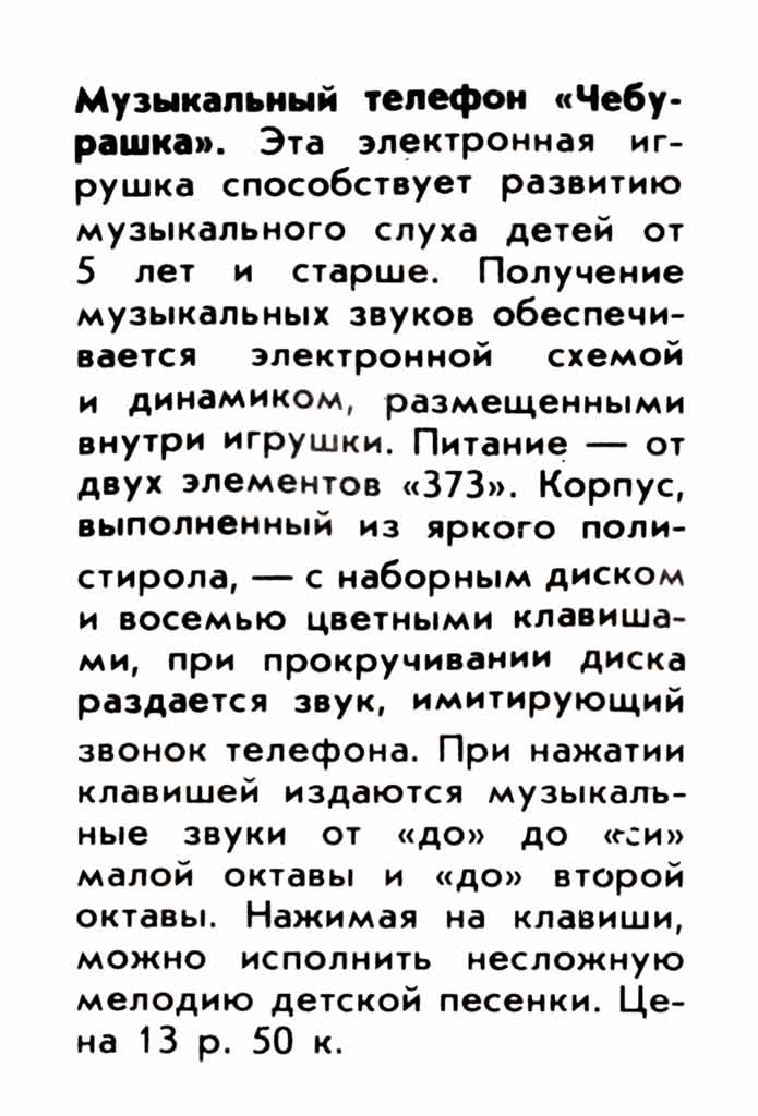 Музыкальный телефон "Чебурашка" производился малосерийно предположительно с 1988 года. "Чебурашка" - это электронная игра для развития музыкального слуха у детей.