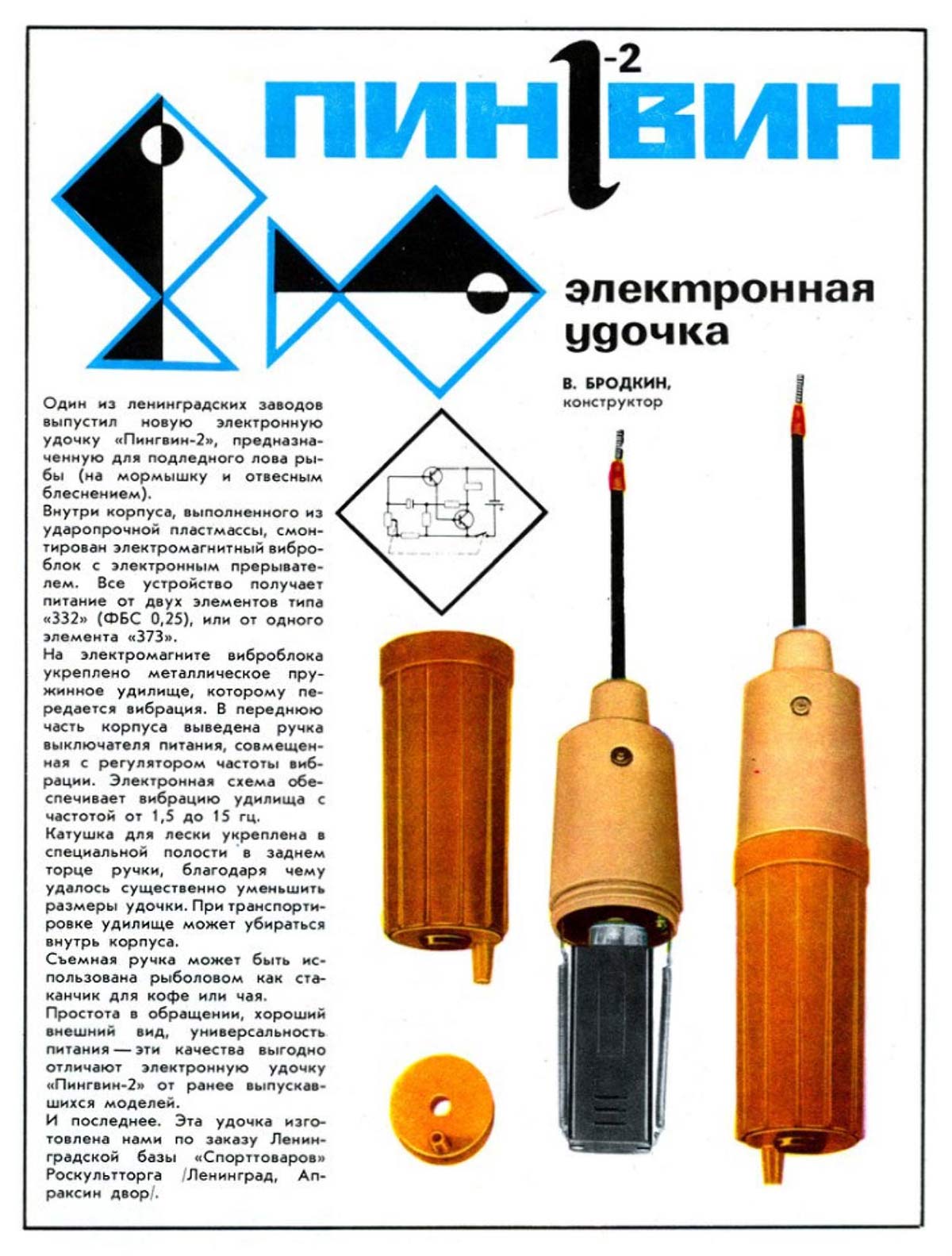 Электронная удочка "Пингвин-2" выпускалась 1974 года в Ленинграде. Удочка служит для подлёдного лова рыбы на мормышку с отвесным блеснением.