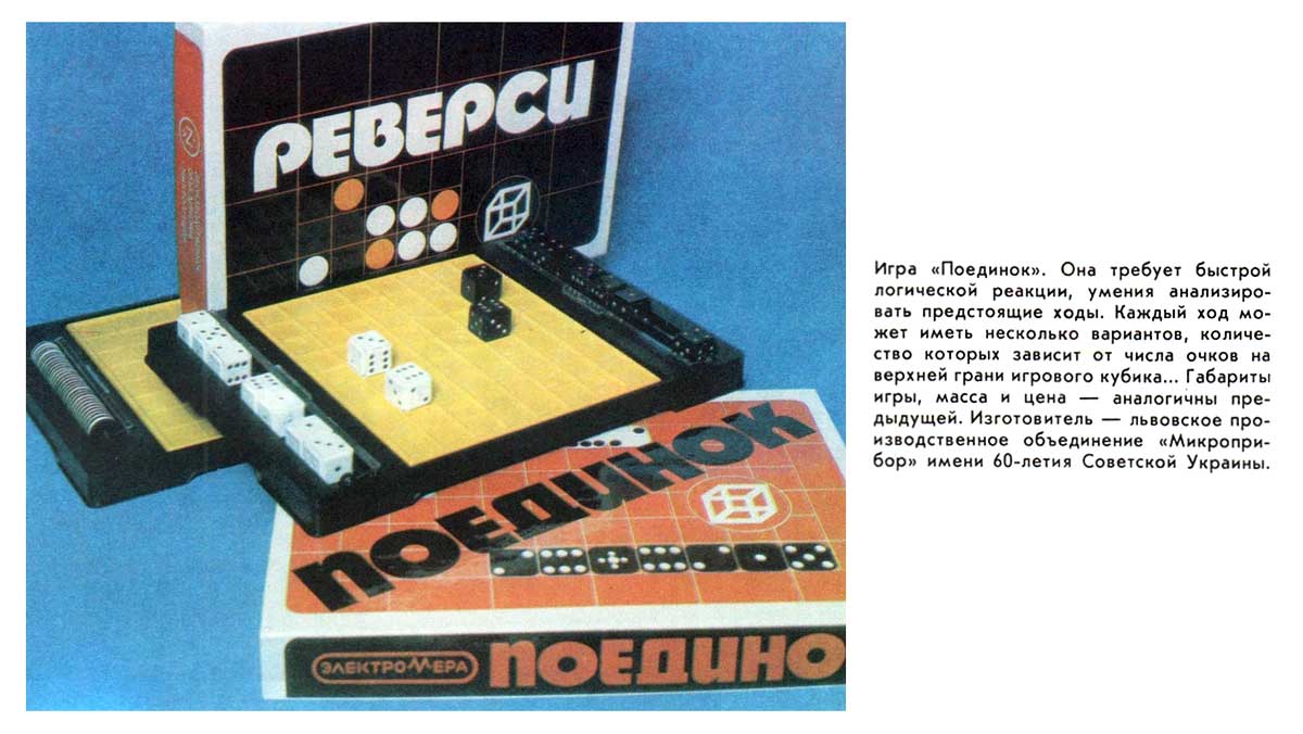 Логическая игра "Поединок" производилась предположительно с 1983 года Львовским производственным объединением "Микроприбор". Игра для двоих участников на реакцию и умение анализировать ситуацию.