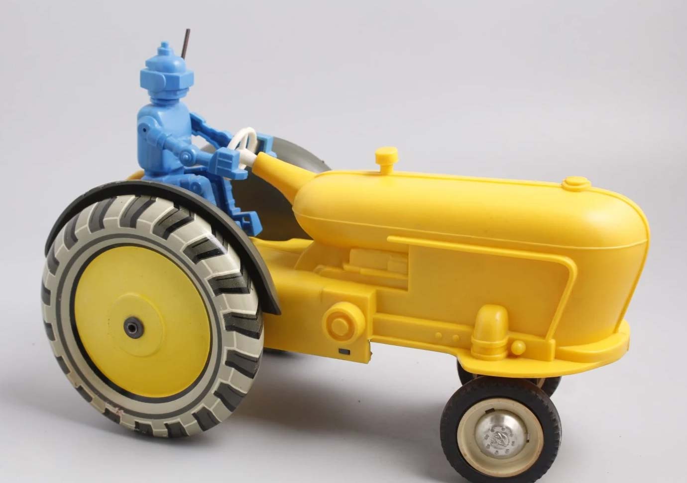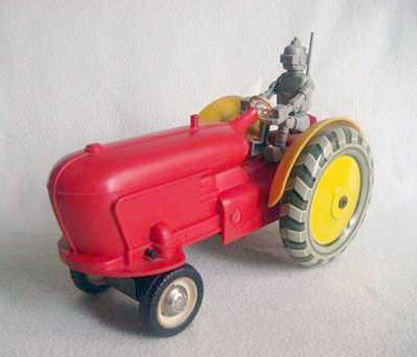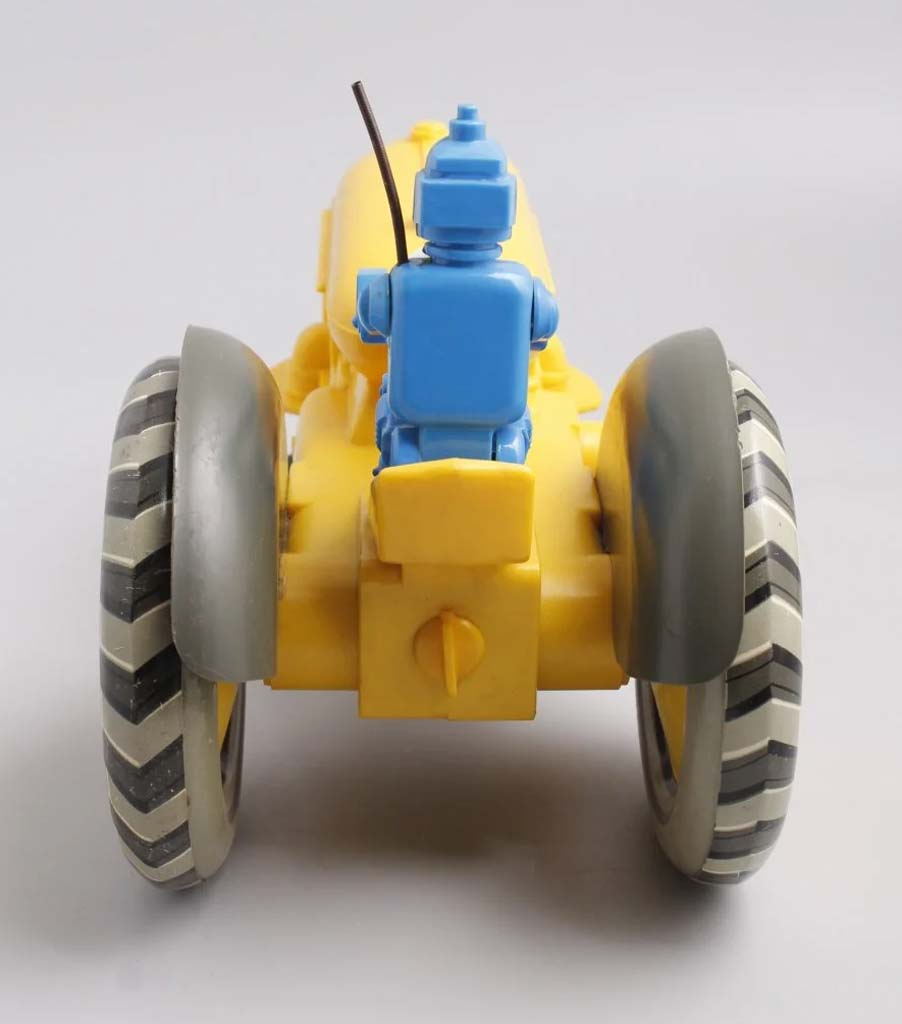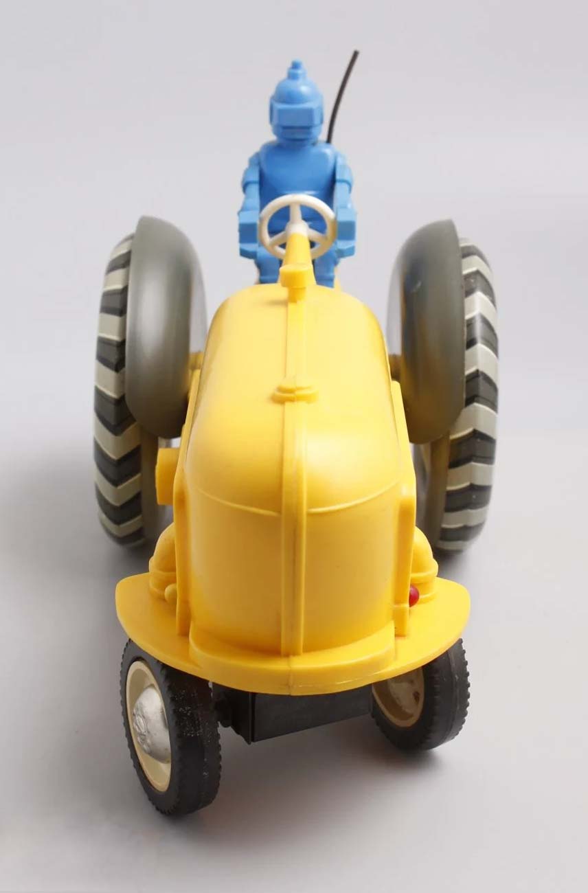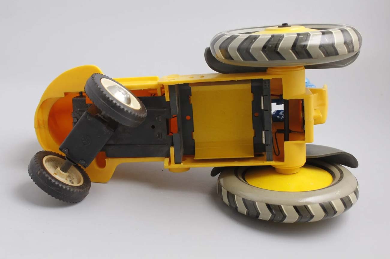 Электромеханическая игрушка "Робот на тракторе" выпускалась возможно с 1965 года Ленинградским заводом металлоизделий. От квадратной батареи КБС трактор может двигаться и объезжать препятствия.