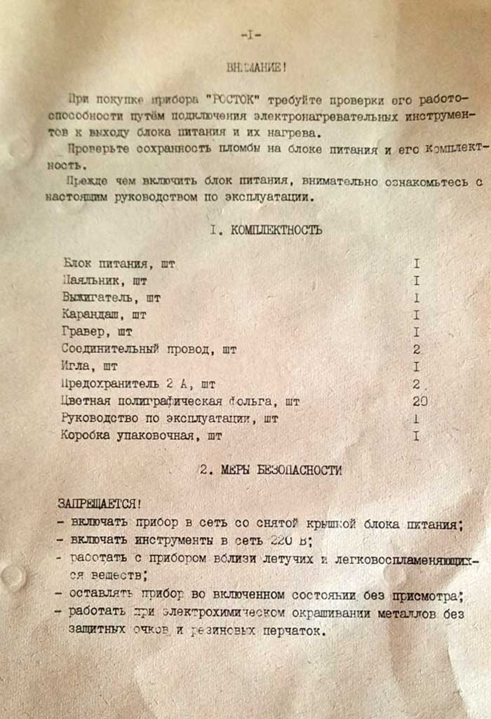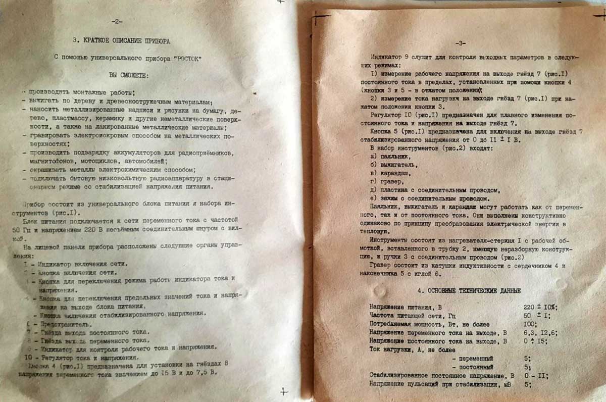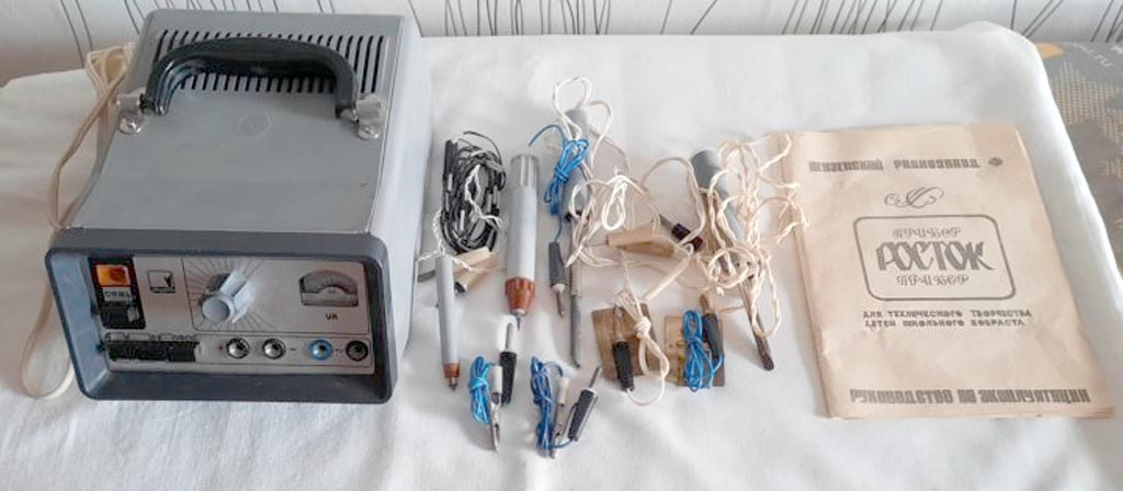 Универсальный пибор "Росток-2" выпускался возможно с 1988 года Пензенским радиозаводом. Прибор предназначен для пайки, гравировки, выжигания по дереву и других работ.