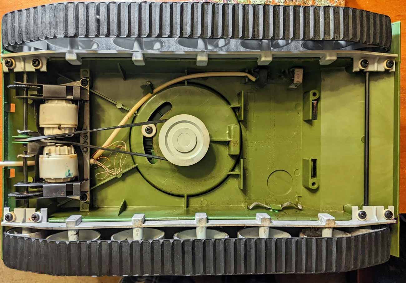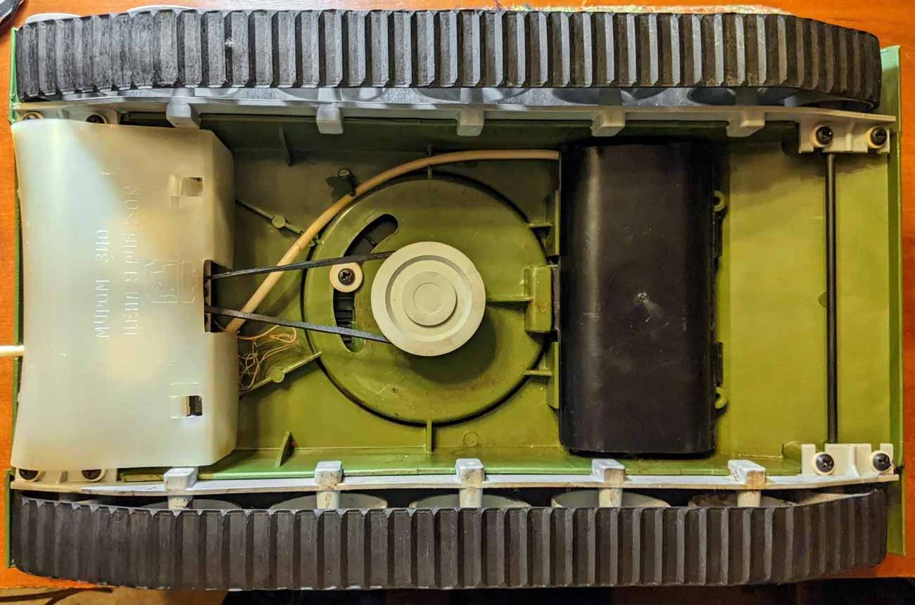 Детская электромеханическая игрушка "Танк" выпускалась возможно с 1977 года Муромским заводом имени Орджоникидзе. Движение вперёд, назад, вправо, влево. 4 элемента 373.