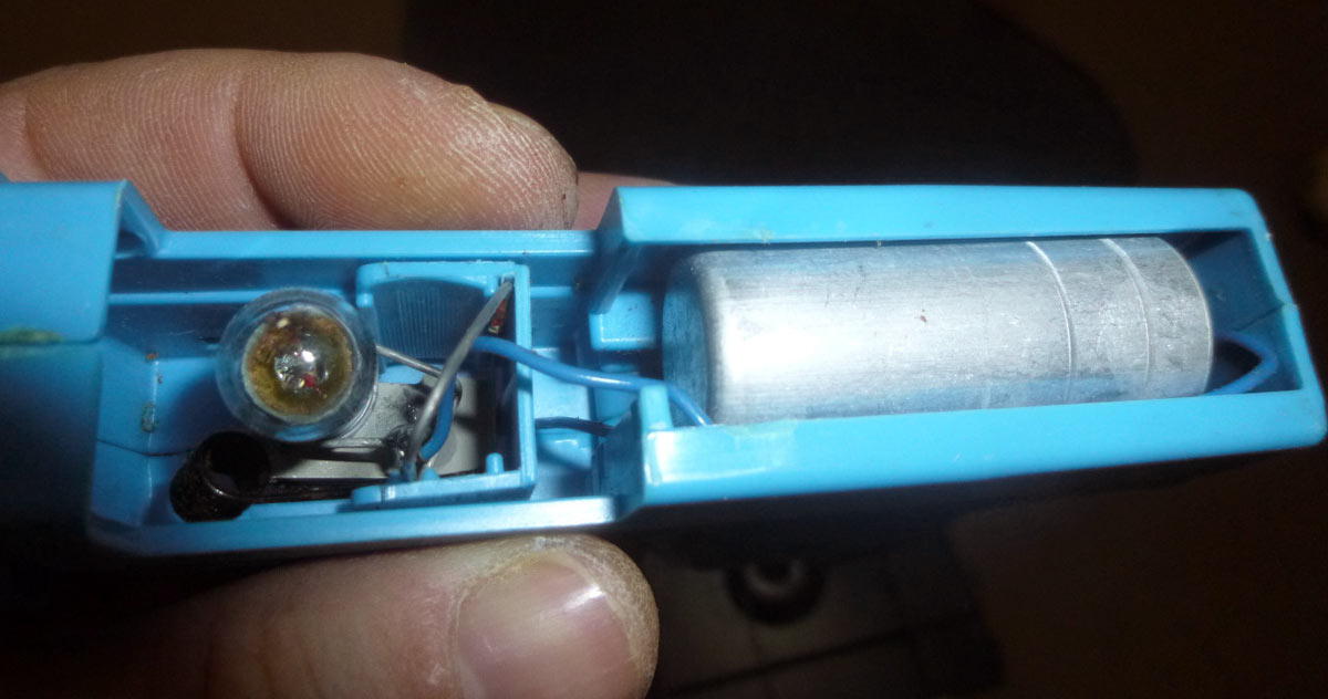 При нажатии на курок, накопленная энергия подаётся на лампу накаливания