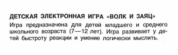 Детская электронная игра "Волк и заяц" производилась предположительно с 1984 года неустановленным предприятием. Кроме рекламной за 1985 год, другой информации по электронной игре "Волк и заяц" нет.