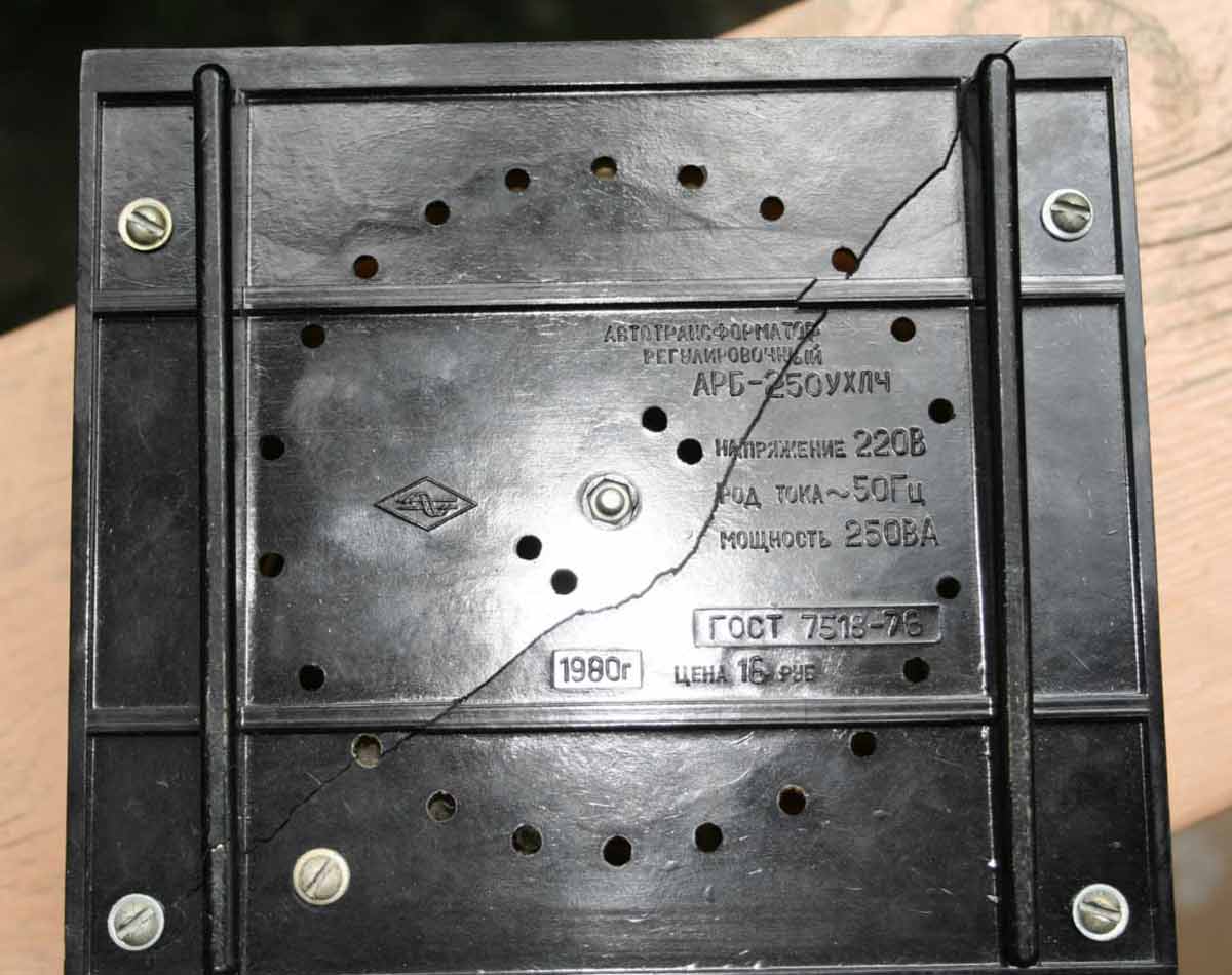 Автотрансформатор регулировочный бытовой "АРБ-250" выпускался возможно с 1980 года. Для ручного поддержания напряжения в 220 В при изменении его на входе от 150 до 250 В. Мощность нагрузки 250 Вт.