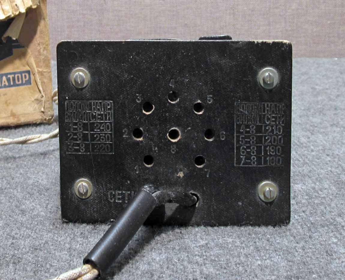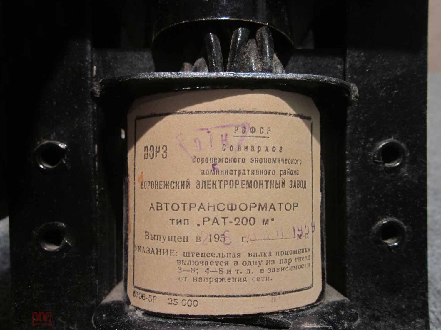 Регулировочный автотрансформатор "РАТ-200 м" выпускался с 1957 года Воронежским электроремонтным заводом. Служит для получения напряжения от 100 до 240 вольт от сети 220 В.