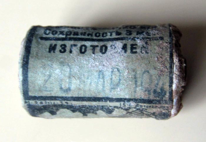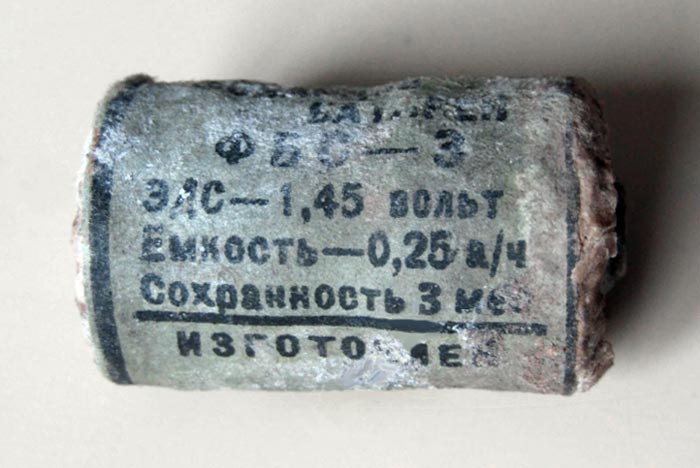 Элемент гальванический сухой фонарный "ФБС-3" выпускался предположительно с 1939 года. ЭДС элемента - 1,45 В. Ёмкость - 0,25 А/ч. Сохранность 3 месяца.