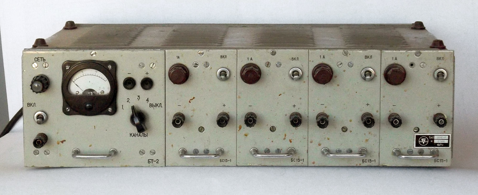 Блок питания "БПНС-4" выпускался с 1971 года. В БП 4 независимых блока стабилизированного напряжения с регулировкой до 15 В, ток 1 А.