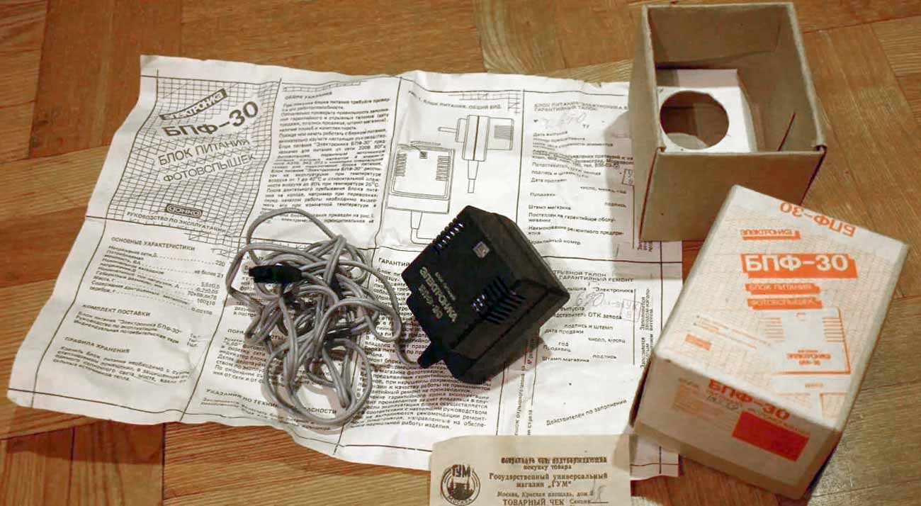 Блок питания фотовспышек "Электроника БПФ-30" производился предположительно с 1992 года Московским заводом "Стелла" А/О "Резел". Питание - сеть 220 В. Стабилизированное напряжение 5,6 В. Ток 0,2 А.