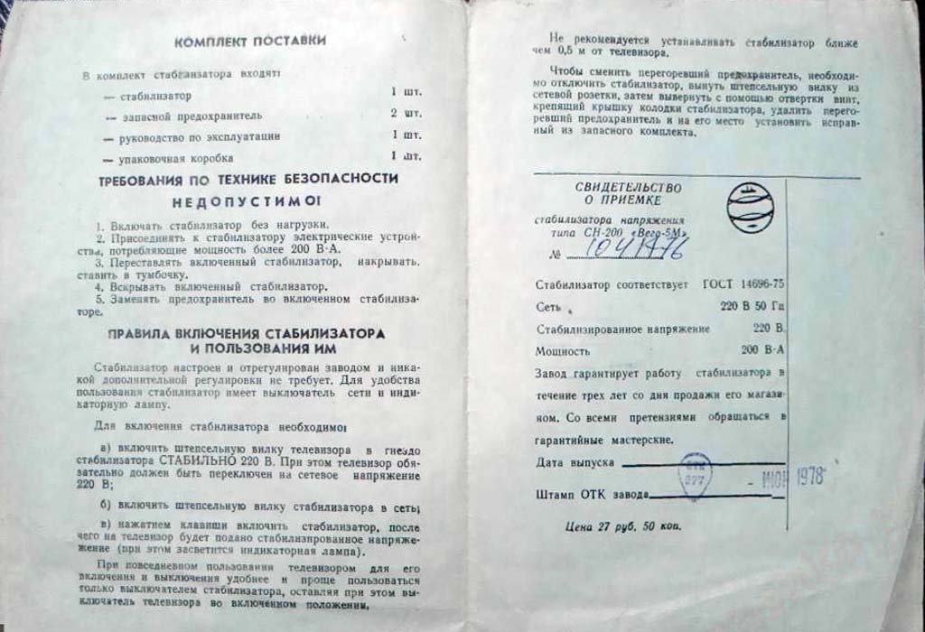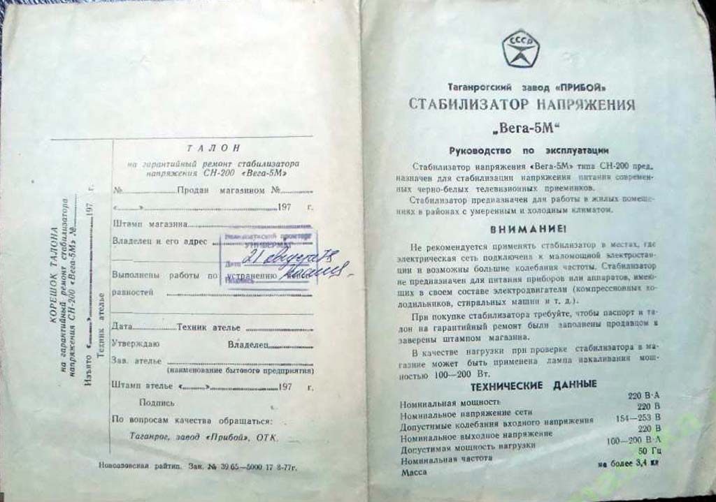Стабилизатор напряжения "Вега-5М" (СН-200) выпускался возможно с 1978 года Таганрогским заводом "Прибой". Для автоматического поддержания напряжения 220 В с мощностью 200 Вт.