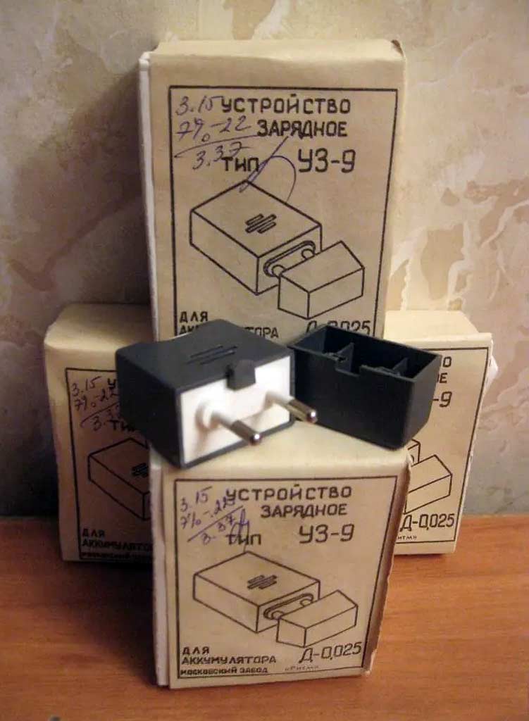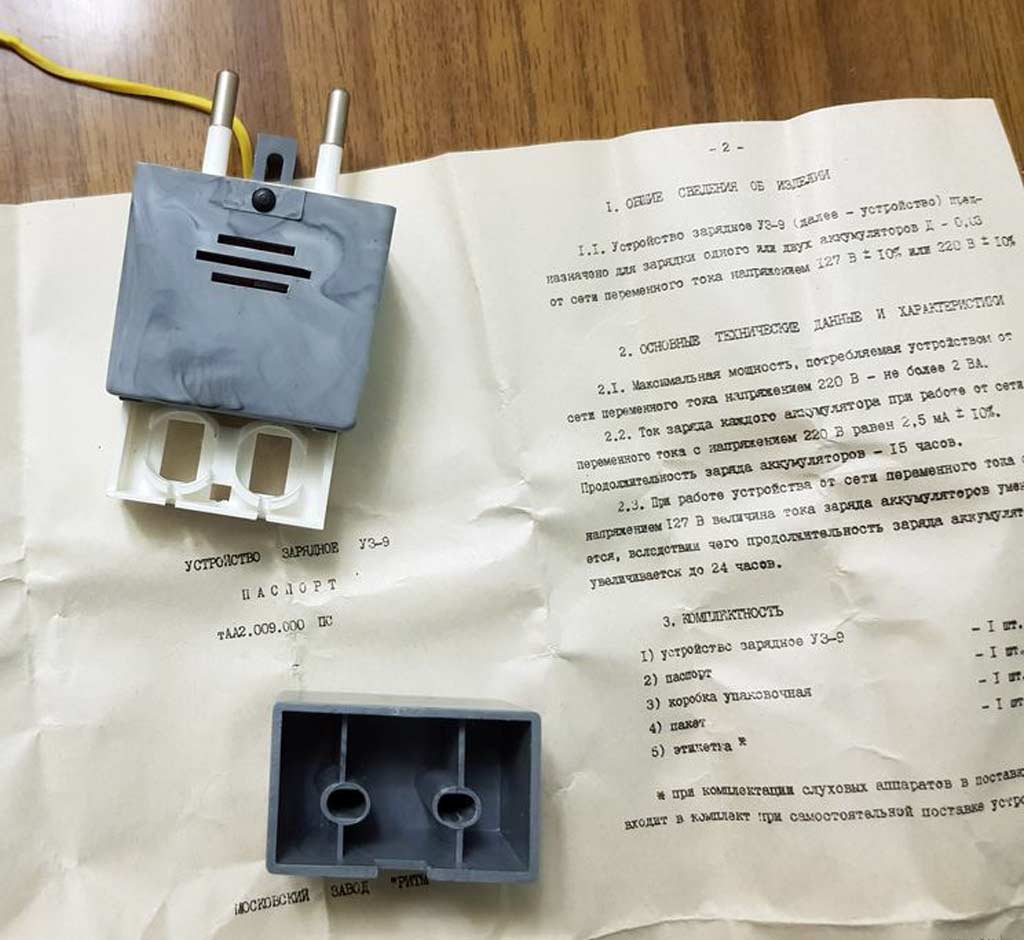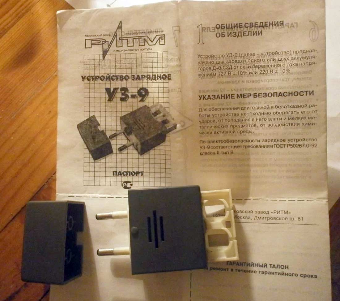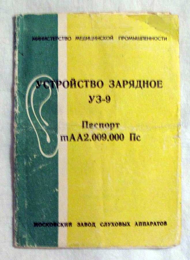 Устройство зарядное "УЗ-9" предположительно с 1960 по 1990 годы выпускал Московский завод слуховых аппаратов, позднее завод "Ритм". Служит для зарядки аккумуляторов для слуховых аппаратов Д-0,03/Д.