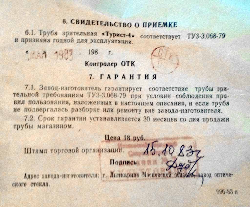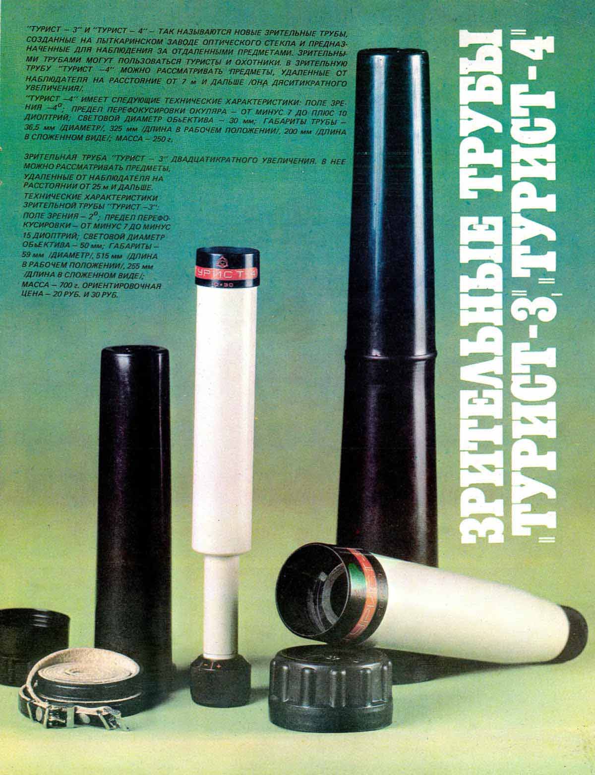 Зрительные трубы "Турист-3" и "Турист-4" с 1980 года выпускал Лыткаринский завод оптического стекла. Предназначены для наблюдения за отдалёнными предметами. Увеличение 10Х и 20Х соответственно.