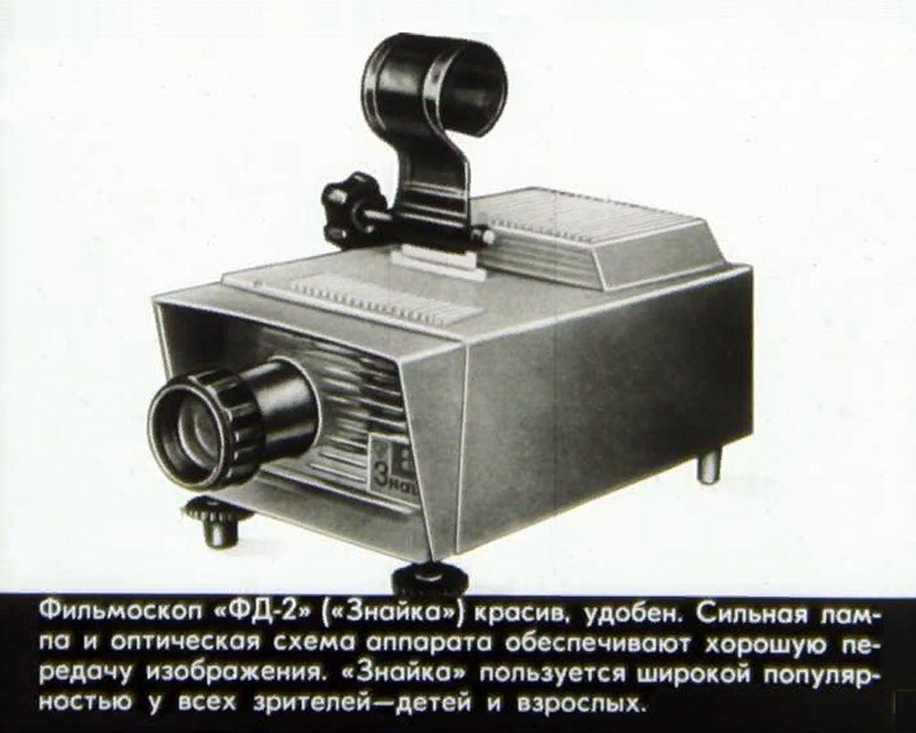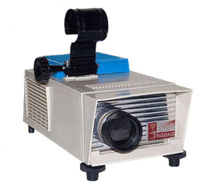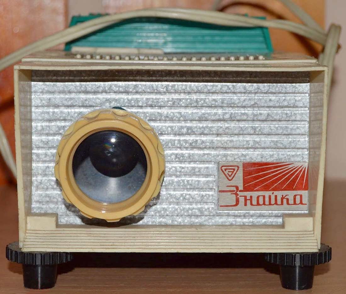 Фильмоскоп "Знайка" выпускали с 1968 года. Служит для демонстрации диафильмов на экран диагональю до 1,7 метра. Лампа К6-30-1. Объектив типа "Перископ".