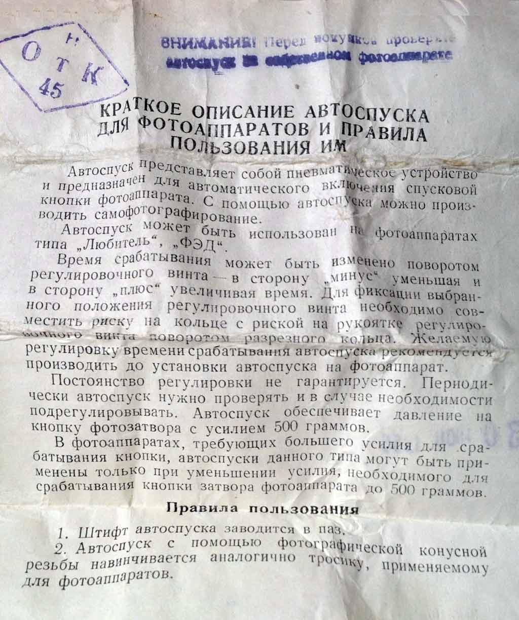 обеспечивает давление на кнопку фотозатвора с усилием 500 граммов. Автоспуск