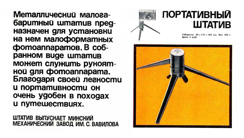Портативный фотоштатив предположительно с 1971 года выпускался Минским механическим заводом имени С. Вавилова.