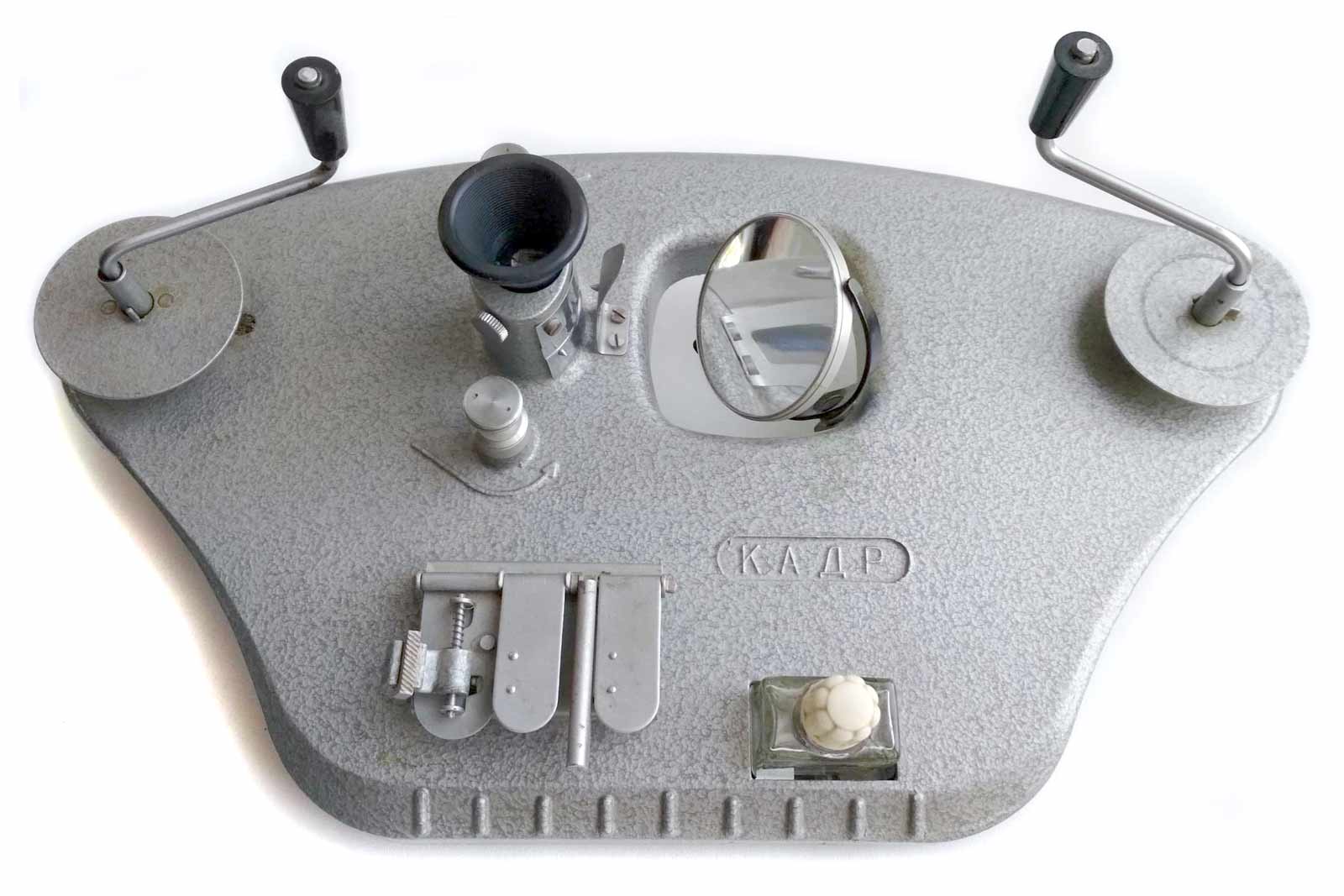 8 мм любительских кинофильмов. Он имеет склеечный прессик, лупу для просмотра