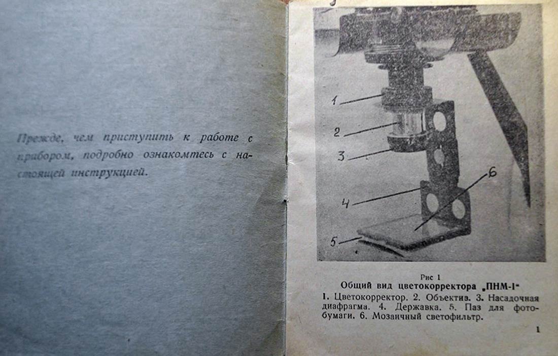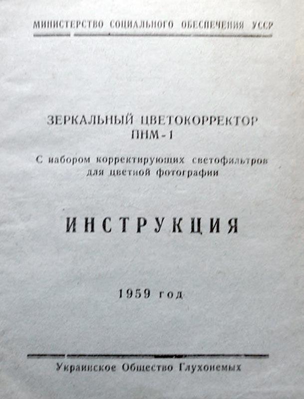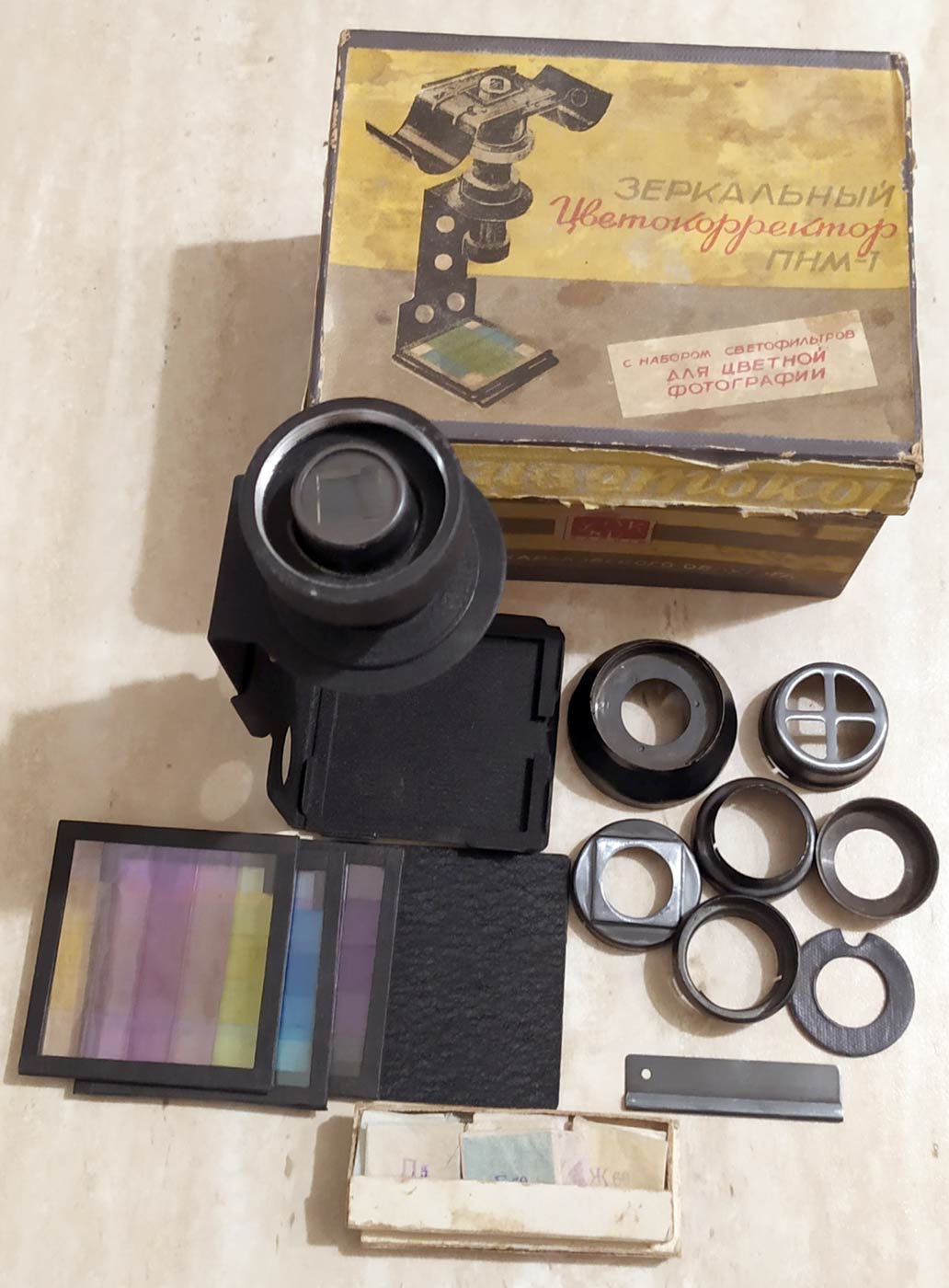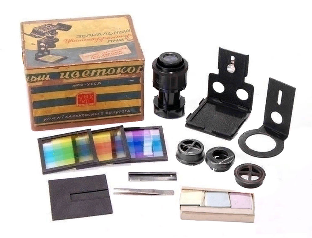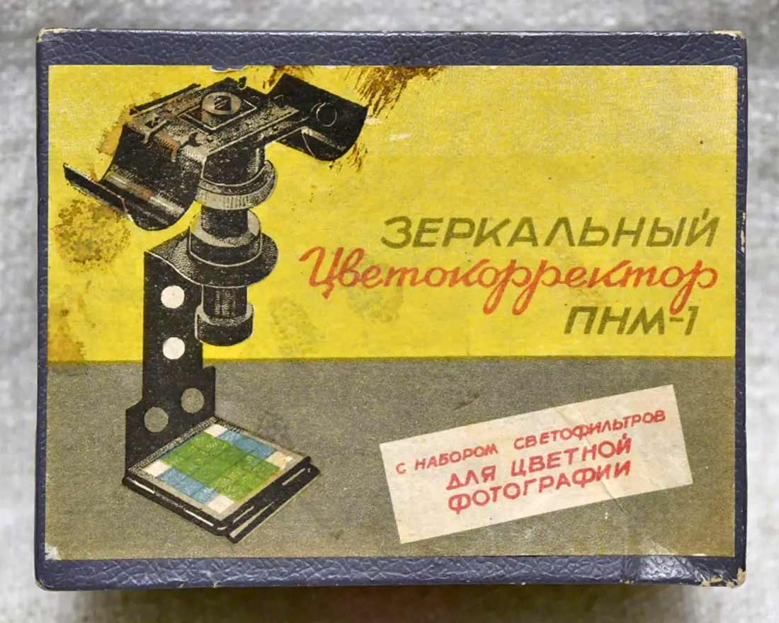 Зеркальный цветокорректор "ПНМ-1" с набором светофильтров для цветной фотографии выпускал с 1957 года Харьковский УПК-1, Украинская ССР.