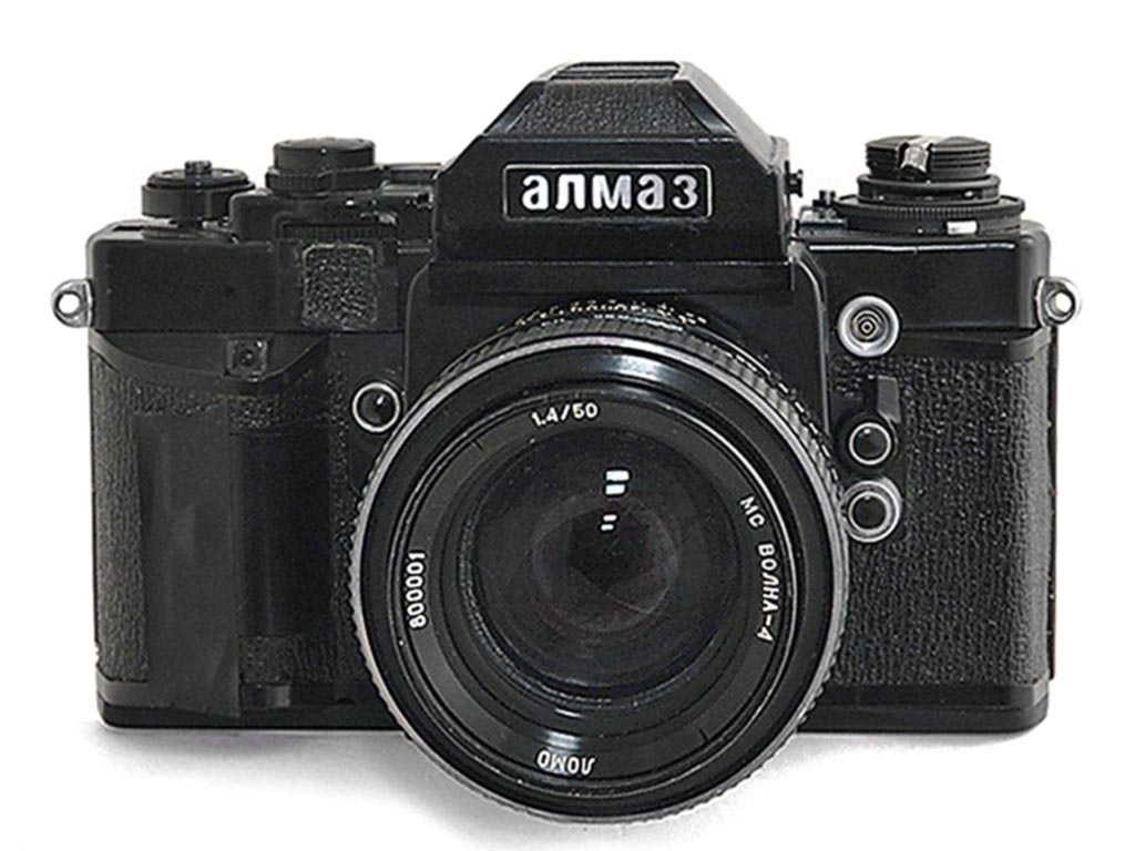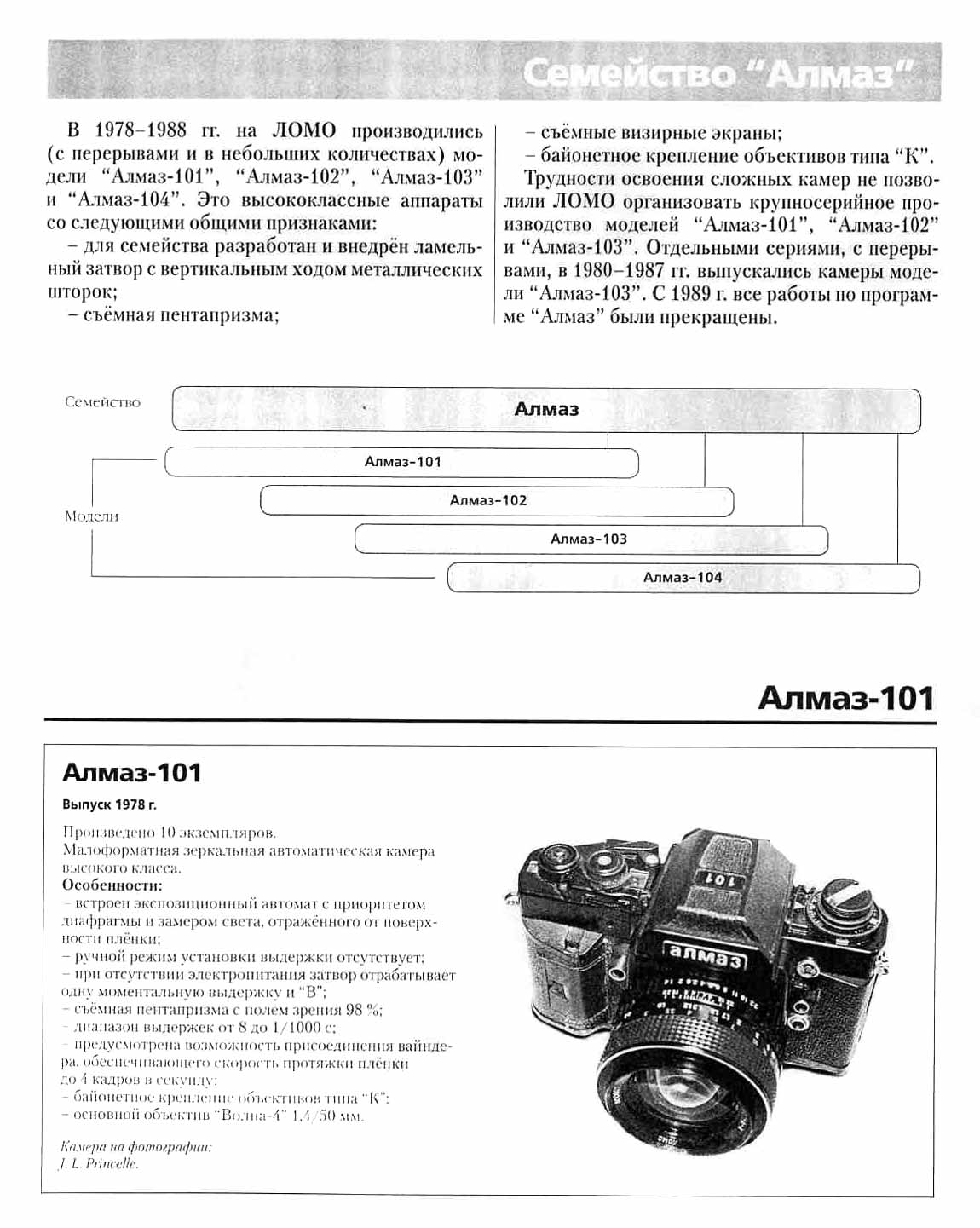 Высококлассный зеркальный фотоаппарат "Алмаз-101" разработан и выпущен в незначительном количестве в 1978 году на "ЛОМО". Скан из каталога-классификатора "1200 фотоаппаратов из СССР".