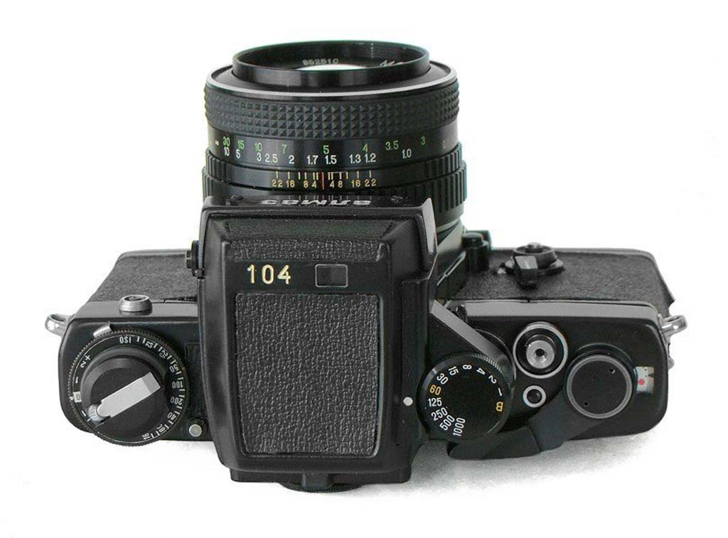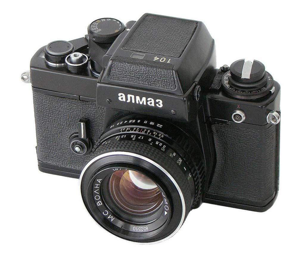 Зеркальный фотоаппарат "Алмаз-104" произведён в 1988 году на ЛОМО. Всего выпушено шесть экземпляров. В основном повторяет модель "Алмаз-102".