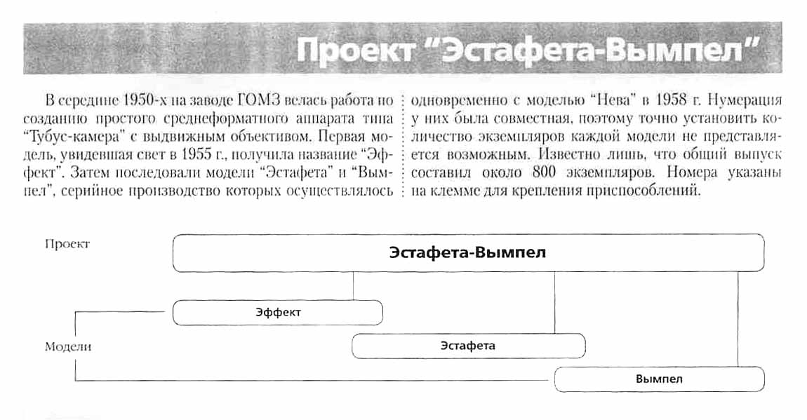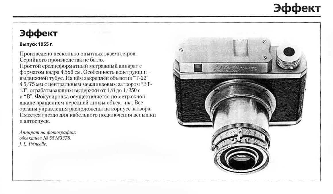 Среднеформатный фотоаппарат "Эффект" выпущен в нескольких экземплярах на Ленинградском заводе ГОМЗ. Сканы из каталога-классификатора "1200 фотоаппаратов из СССР".